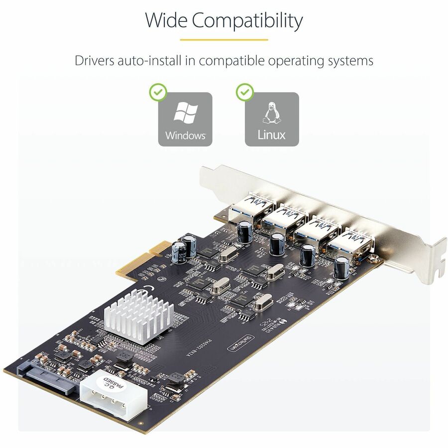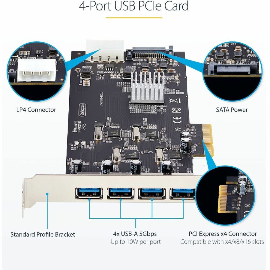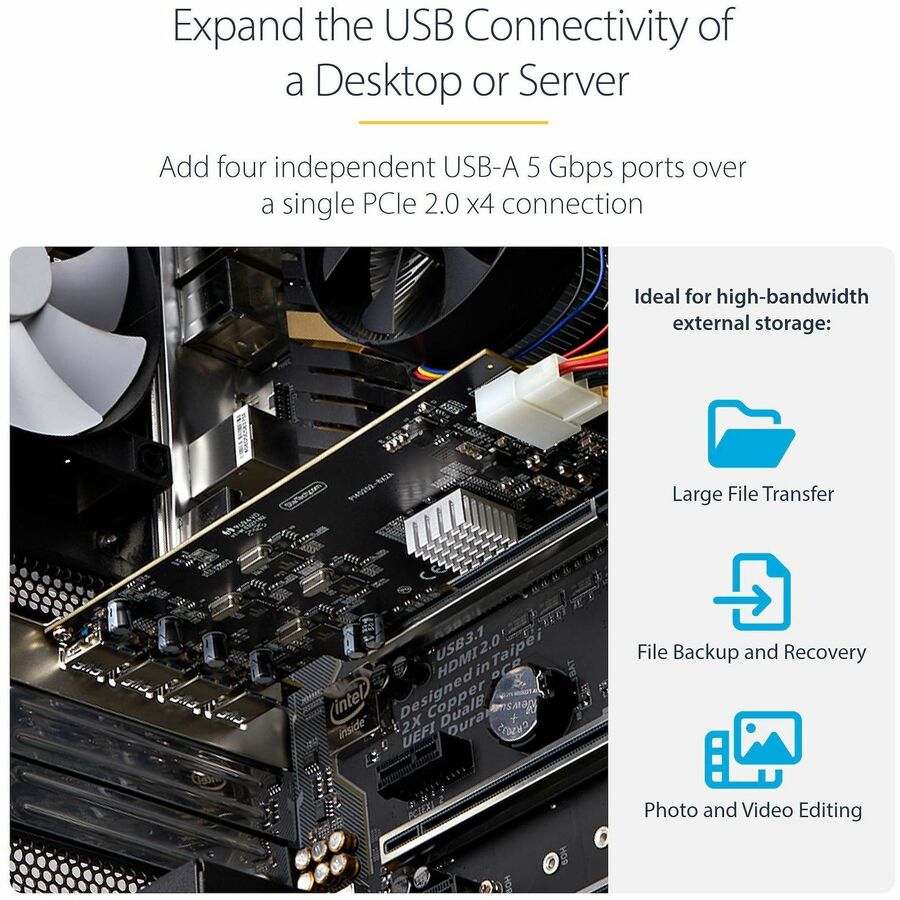 - HIGH-PERFORMANCE USB CARD: Upgrade or expand a desktop or server's USB connectivity by adding four USB Type-A ports, each with a dedicated controller capable of up to 5Gbps, via a single PCI Express 2.0 x4 connection