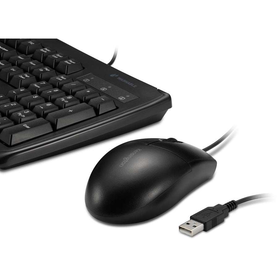 The Pro Fit® Wired Washable Keyboard and Mouse Set, with its waterproof, easy-clean, rugged design, is ideal for maintaining a hygienic surface and cleaning up drips and spills, without sacrificing performance. IP67 mouse rating and IPx6 keyboard rating means this set can easily stand up to frequent cleaning with water and solvents. Full-size, six row, 104-key keyboard includes a numeric keypad, and laser-etched keys feature highly readable letters that won't wear off. Ambidextrous, contoured mouse with three-button scroll wheel provides a comfortable experience for left- and right-handed users. High-definition 1600 DPI optical sensor tracks the mouse's movements with smooth accuracy for optimal performance and productivity. Wired USB connection delivers reliable performance without the need for batteries. Plug-and-play, so there's no software to download and install. Ideal for home, office, education, hospital/medical environments, or retail. Three-year limited warranty. Do not immerse the USB connector.