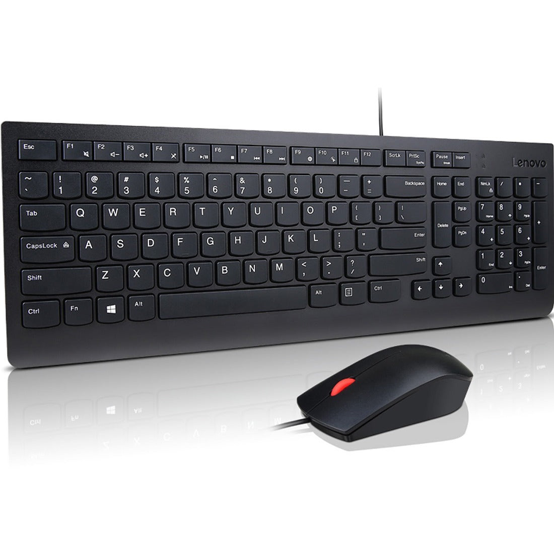 The Lenovo Essential Wired Combo keeps things uncomplicated. This durable keyboard and mouse plugs into any USB port with wired reliability you can count on. The tough waterproof membrane can handle accidental spills without risking performance. Enjoy feel-good typing with quiet keys and number pad in a modern space saving layout. An ergonomic full size mouse offers comfort and support for all day use. Increase your productivity as you smoothly complete tasks with the 1000dpi high resolution optical sensor.