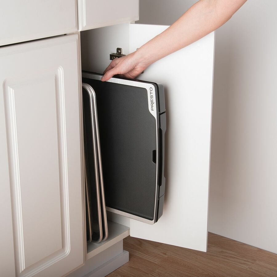 The Tilt-n-Fold griddle offers convenience and versatility for breakfast, lunch, and dinner. It easily adjusts from a level cooking surface for eggs and pancakes to a tilted surface for meats. Simple flip-down levers tilt the grilling surface to drain meat while cooking. For compact storage, just fold in the legs and the drip tray locks in place. It fits neatly in most standard 18-inch cabinets. The heavy cast aluminum base with premium nonstick cooking surface ensures stick-free cooking and easy cleaning. The desired cooking temperature is maintained automatically with the Control Master* heat control. Slide-out drip tray removes for quick cleanups, and the griddle is fully immersible with the heat control detached.