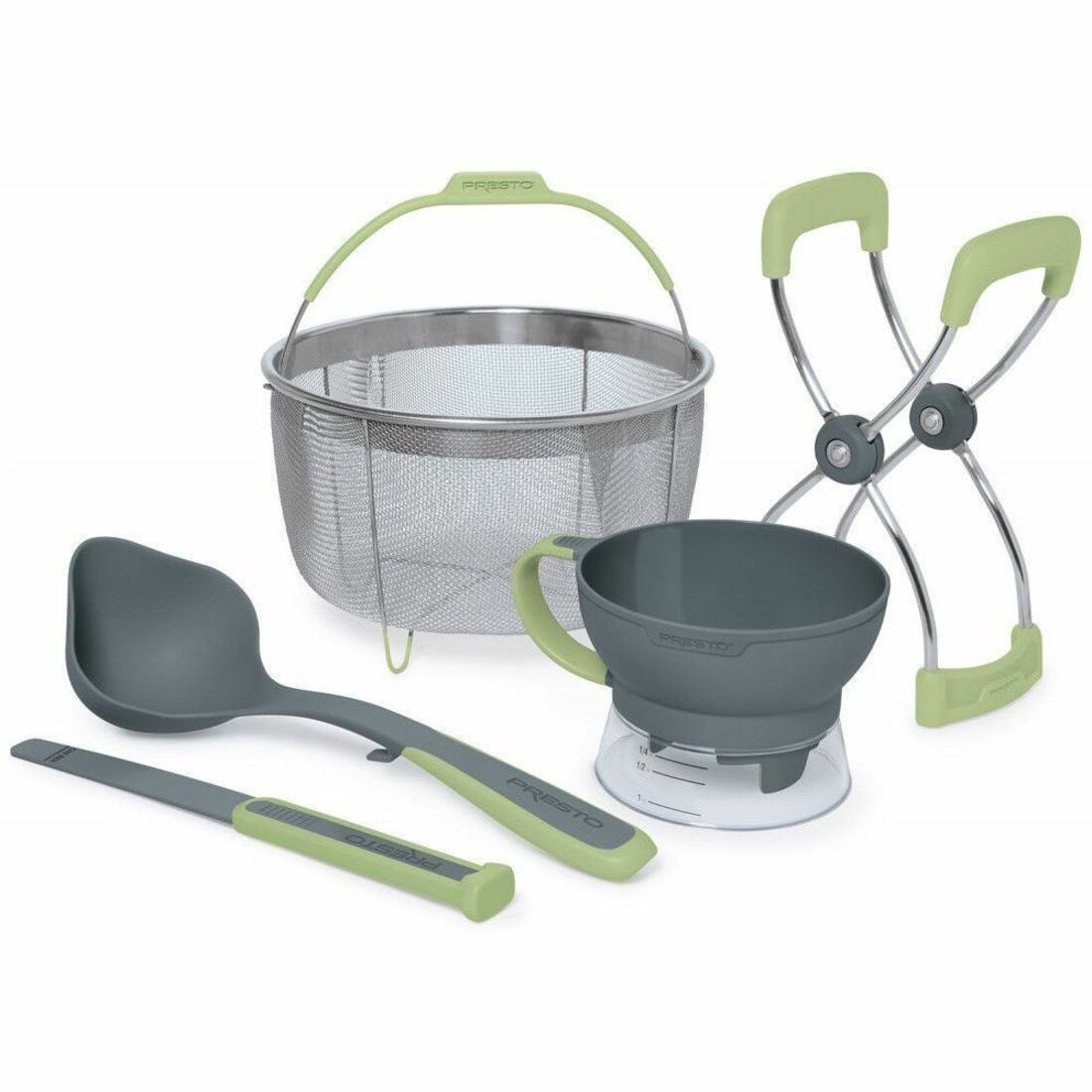 This five-piece accessory set includes a stainless steel blanching basket, canning funnel with headspace measure, combination bubble remover/magnetic lid lifter/water measure, jar lifter, and wide-scoop ladle.