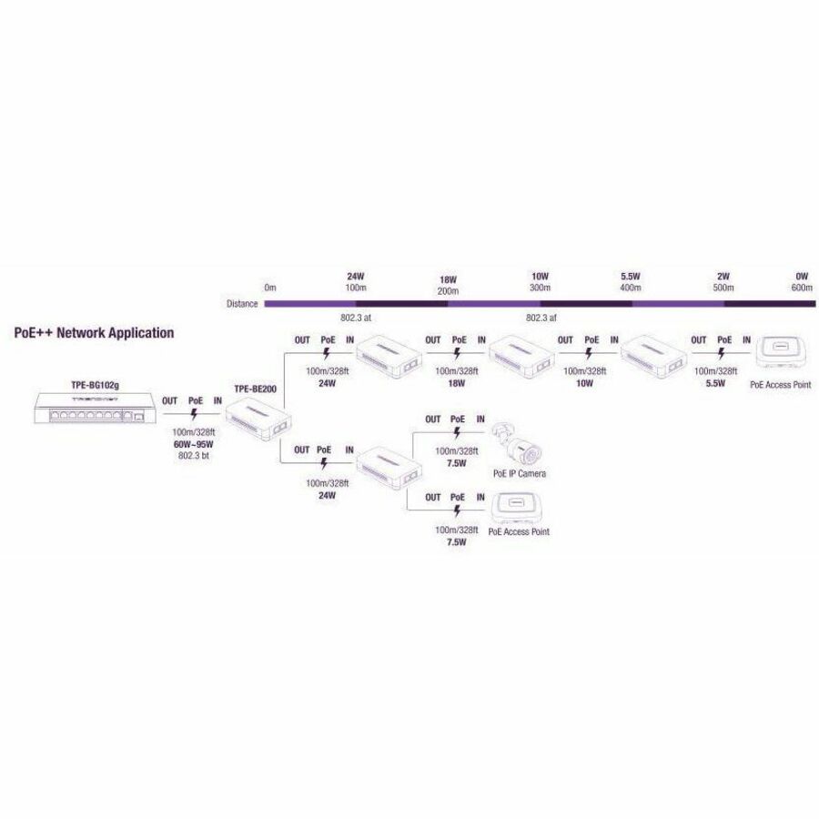 TRENDnet's 2-Port Gigabit PoE++ Extender, model TPE-BE200, takes a single PoE++ (60W) connection and extends it an additional 100m (328 ft.) for up to two PoE+ (30W) devices. This dual/multi-port extender auto-detects a PoE (15.4W), PoE+ (30W), or PoE++ (60W) input, and extends it for a total distance of up to 200m (656 ft.) from the PoE source. Daisy chain up to four extenders for a total PoE network extension of up to 500m (1,640 ft.). This gigabit PoE++ range extender features a single PoE++ (60W) input port and two PoE+ (30W) output ports.