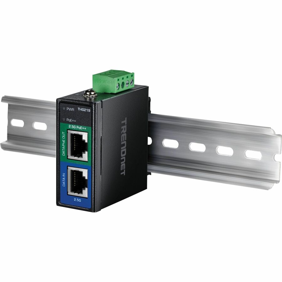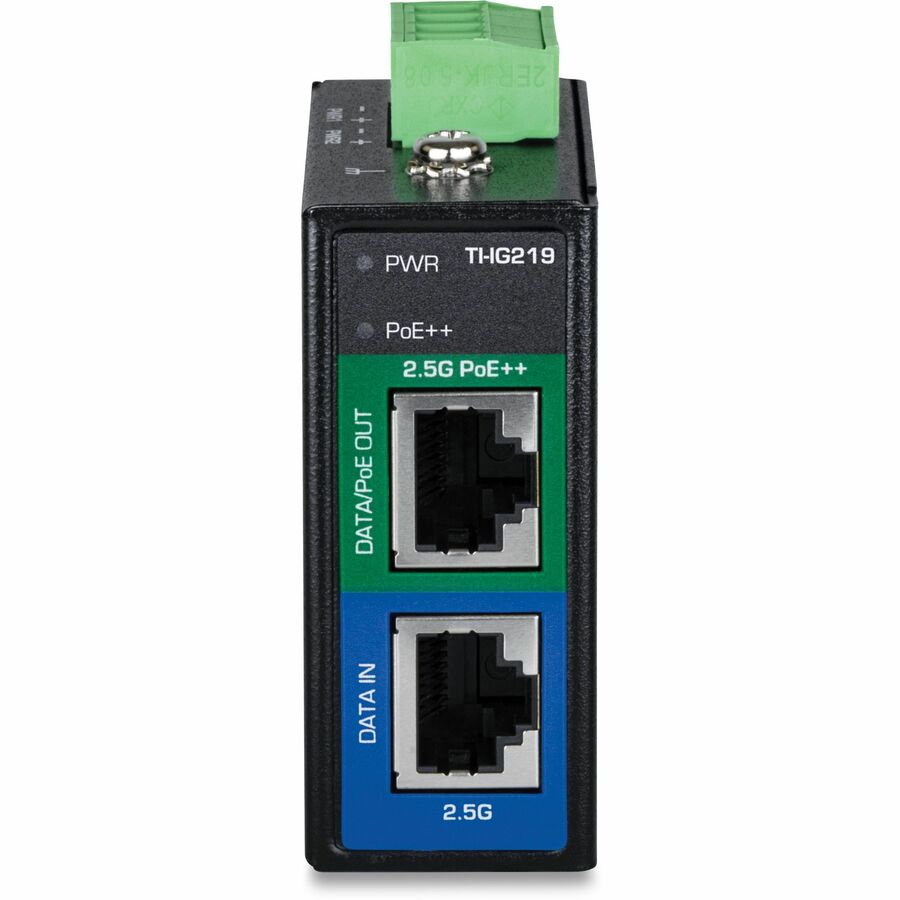 TRENDnet's Industrial 2.5G PoE++ Injector, model TI-IG219, allows users to add PoE++ power to a non-PoE 2.5G switch. Connect the 2.5G PoE++ injector to a non-PoE switch, and then run an Ethernet cable up to 100 meters (328 ft.) to network a PoE, PoE+, or PoE++ device. This multi-gig industrial PoE++ injector supplies up to 95W of power to a PoE device. The fanless design conveniently eliminates operating noise and lowers energy consumption. The 2.5G PoE++ injector is equipped with an IP50-rated metal enclosure, designed to withstand a high degree of vibration and shock, while operating within an extreme temperature range of -40° - 75° C (-40° - 167° F) for harsh industrial environments.