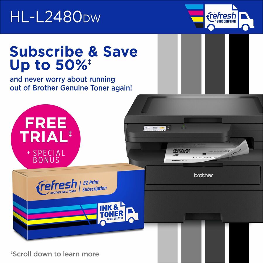 Designed for exceptional efficiency, the HL-L2480DW Wireless Compact Monochrome (Black & White) Multi-Function Laser Printer is an affordable choice for high-quality printing, copying and scanning. Streamlining three critical business functions into one compact footprint, this multi-function wireless printer is an efficient, time-saving addition to any workspace. Consistently producing crisp, easy-to-read black & white prints, as quick as it is efficient, it prints up to 36 pages per minute(1) (ppm). Convenient 250-sheet paper tray(2) reduces the frequency of paper refills, while automatic duplex printing saves time and decreases paper waste. With an integrated 2.7" touchscreen, navigation is simple and straightforward. Use the touchscreen to print-from and scan-to popular cloud-based apps(3). Flexible connection options include dual-band wireless, Ethernet and USB 2.0. Advanced security features offer peace of mind to help safeguard information and maintain secure connections while printing. Disclaimers: