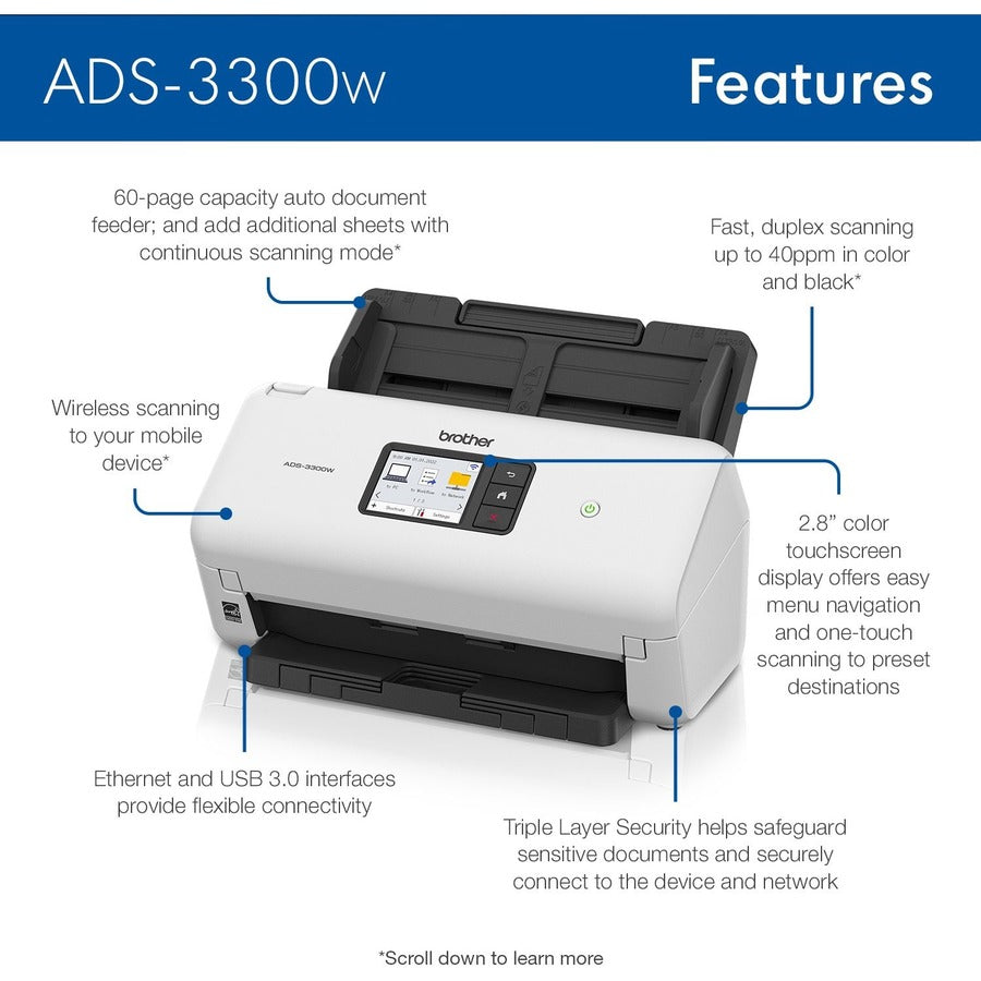 ADS-3300W Wireless High-Speed Desktop Scanner features 2.8" color touch screen for easy, user-friendly control. It provides fast, two-sided scanning up to 40 ppm. Automatic document feeder prints up to 60 pages at a time and up to 6,000 pages daily. Scanning features include continuous scanning, ADF automatic deskewing and blank page skipping. Scan using plain paper, receipts, photos (carry sheet required), business cards, plastic/laminated cards or bond/recycled paper. Duplex scanning speed in black and color is 40 ipm and has interpolated scan resolution up to 1200 x 1200 dpi. It has an optical scan resolution of 600 x 600 dpi. Scan Driver OS is compatible with Windows, MAC OS and Linux. Easily connect to power using AC Adapter (included). Easily connect using one-push Wi-Fi protected setup, Ethernet or SuperSpeed USB 3.0 (USB 2.0 compatible). Connect a USB memory stick to scan to the device. Advanced security protects documents and securely connects to network.