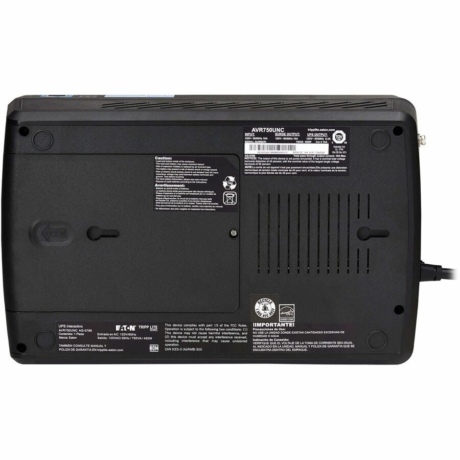 The AVR750UNC line-interactive cloud-connected UPS system with AVR protection provides reliable battery backup and AC power protection against blackouts, brownouts, overvoltages, surges and line noise for computers, routers, gaming systems, ATMs, security systems, digital signage and other home/office networking equipment.