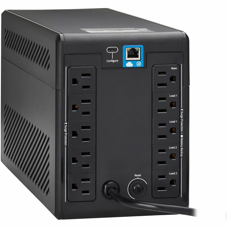 Five 5-15R outlets provide battery backup and surge protection for your computer, monitor, security camera and other crucial equipment. The other five 5-15R outlets provide surge suppression only for desk lamps, speakers and other equipment regarded as non-essential during a blackout. Eaton's remote monitoring application enables individual control of two switchable load banks, allowing them to be powered on, off, or cycled remotely. This remote functionality facilitates the rebooting of equipment that is not responding, thereby eliminating the need for expensive and time-consuming on-site visit.
