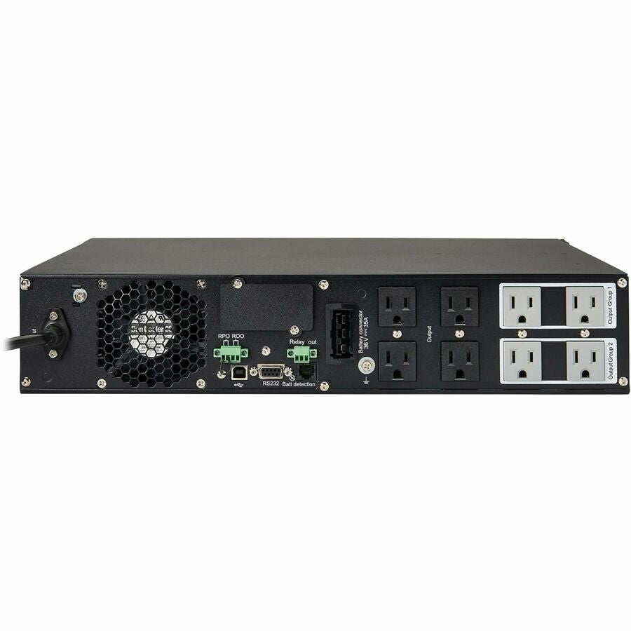 Eight managed 5-15R outlets provide connected equipment with pure sine wave AC output and allow you to monitor power consumption down to the outlet group level. Power provided by these outlets is filtered to protect connected equipment against damaging surges and line noise. Four outlets are grouped into two programmable load banks that let you shed non-critical loads to extend runtime for critical loads. A cooling fan helps protect equipment from overheating.