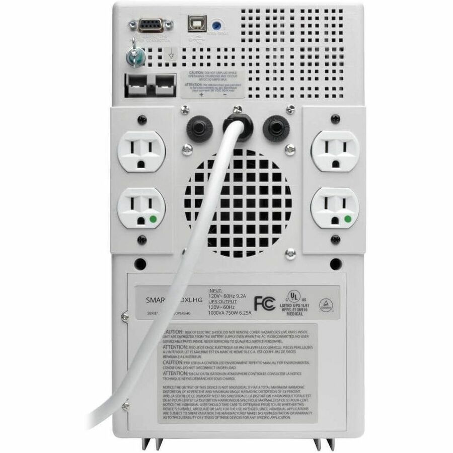 Tripp Lite's SMART1200XLHG medical-grade UPS system provides dependable battery backup and is fully compliant with UL 60601-1 regulations when plugged into a hospital-grade outlet, making it ideal for use in patient-care vicinities. The 1kVA/750W capacity provides up to 28 minutes of runtime for a half load or 10 minutes for a full load, so you can work through short power failures and perform an orderly system shutdown in a prolonged blackout. Built-in line-interactive voltage regulation corrects brownouts as low as 81V and overvoltages as high as 143V to normal 120V nominal output without drawing battery power. The SMART1200XLHG's built-in isolation transformer with Faraday shield offers full isolation and removes common mode noise, while maintaining full AC surge suppression in all modes. This UPS system features four NEMA 5-15R-HG hospital-grade outlets and has a hospital-grade NEMA 5-15P-HG plug with a six-foot cord for flexibility in placement. All four outlets provide both backup protection and surge protection rated to 940 joules. The SMART1200XLHG also features diagnostic LEDs, as well as a USB port and a DB9 serial port that work with Tripp Lite's included PowerAlert software for safe, unattended system shutdown and file saves in the event of a prolonged power failure.