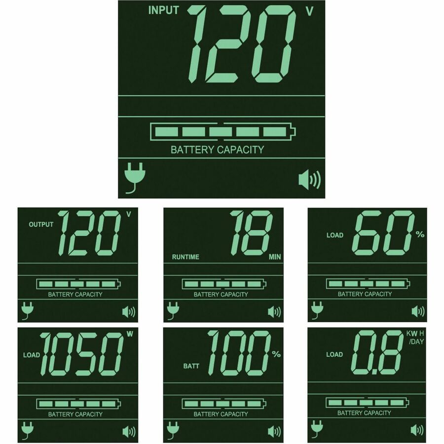 The front-panel LCD information and configuration screen displays detailed UPS and site power status and operating data, as well as input and output voltage, operating mode, alarm function and additional options. An alarm sounds to warn you of power failure, low battery, overload, UPS fault and remote shutdown conditions. The LCD rotates to accommodate both rack-mount and tower configurations.