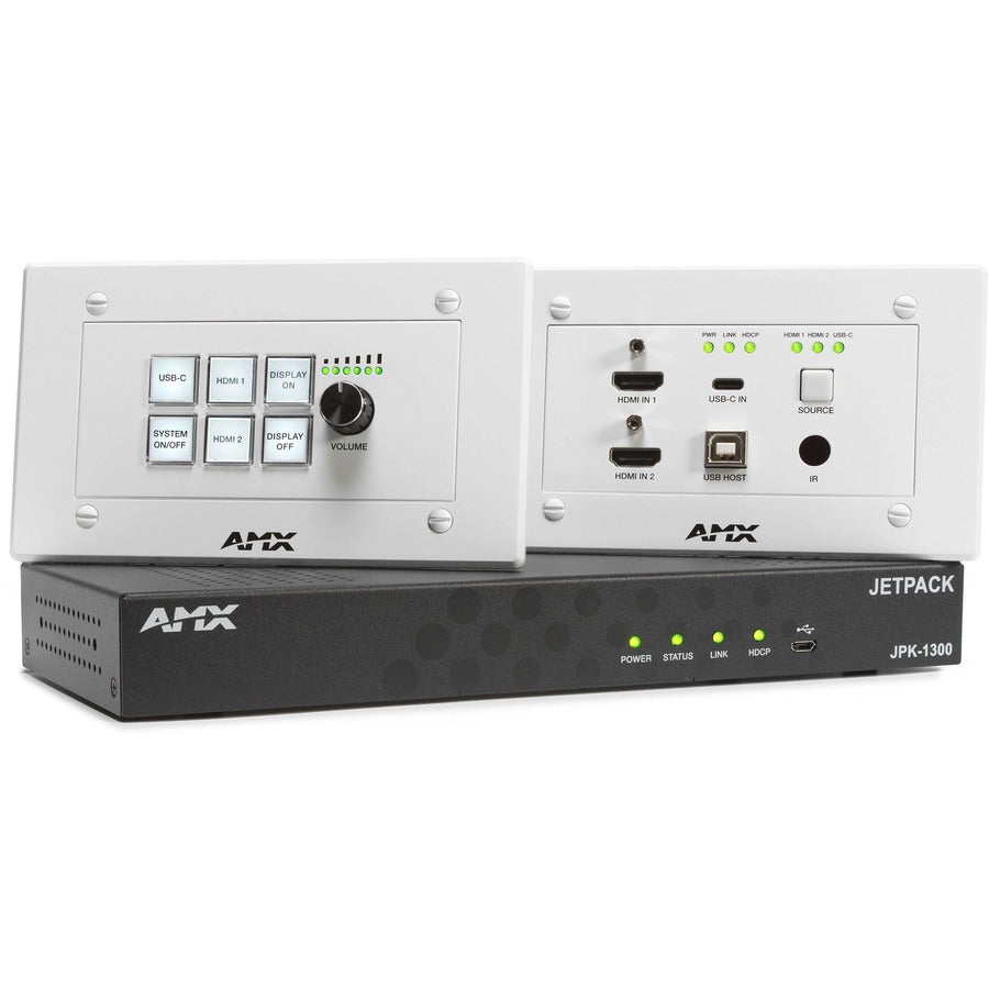 AMX Jetpack is an incredibly affordable switching, transport, and control solution for K12 classrooms and small-to-medium meeting spaces that provides simple to operate room controls, multiple video inputs, and enables voice lift for clear communication with everyone in the space. The JPK-1300 combines 4K60 4:2:0 HDMI and USB-C video switching and distance transport, room control, wallplate accessibility, and audio amplification in a kit that requires zero programming and provides the security and reliability that AMX is well known to provide.