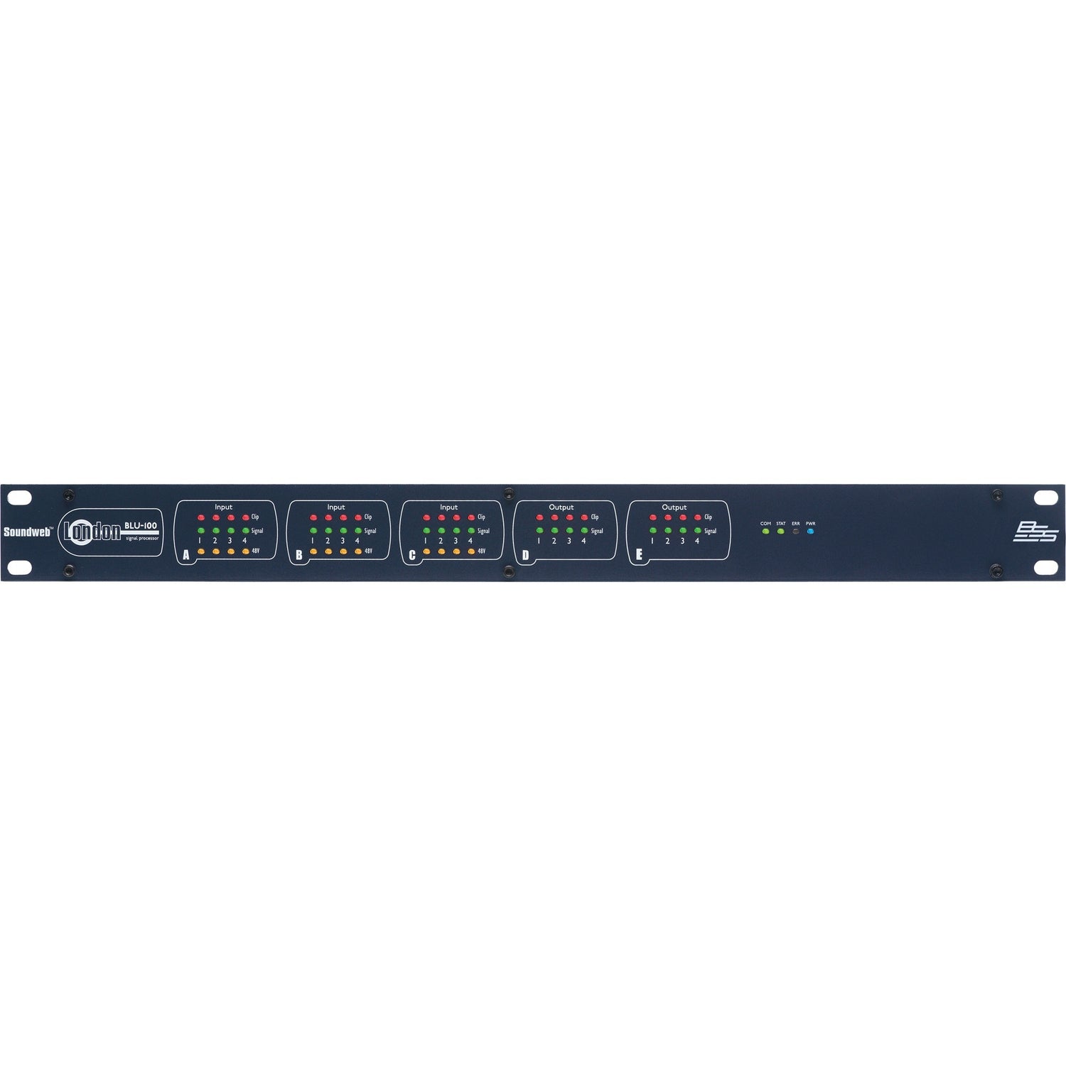 The Soundweb London BLU-100 offers a fixed configuration of 12 inputs and 8 outputs, configurable signal processing and a high bandwidth, fault tolerant digital audio bus.