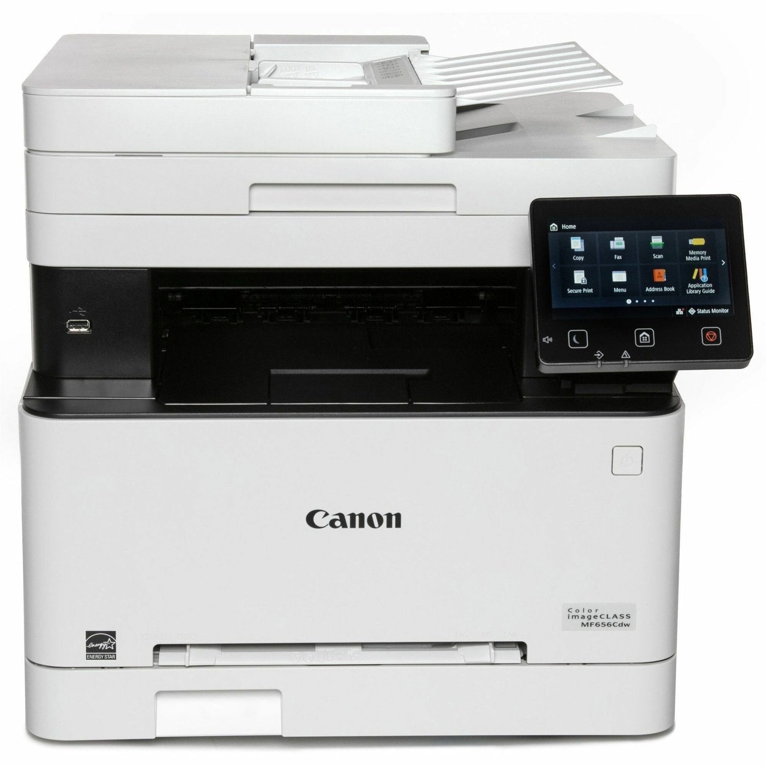 Conveniently print, copy, scan and fax using this compact, Color imageClass MF656Cdw All-in-One Wireless Laser Printer. It prints letter-size documents as fast as 22 ppm. Printer features a 50-sheet automatic document feeder (ADF), 250-sheet input tray and a one-sheet, manual feed slot. Print and copy in resolutions up to 1200 x 1200 dpi and scan up to 600 x 600 dpi. Printer includes automatic, two-sided printing and one-pass, two-sided scanning to increase efficiency. Included toner prints a maximum of 1,350 in black/white and 1,250 in color using Canon Genuine Toner Cartridge 067. Easily set up a wireless connection in four simple steps and print on-the-go with your mobile device using the Canon Print Business app, AirPrint and Mopria. Quickly navigate printer options with the 5" , color, touch-screen LCD. Connect with high-speed 2.0 USB, Ethernet, Wi-Fi or Wi-Fi Direct Connection.
