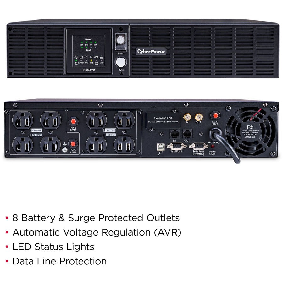 A rack/tower UPS with line interactive topology, the CyberPower Smart App CPS1500AVR provides battery backup (using simulated sine wave output) and surge protection for department servers, workgroup servers, workstations, network devices, and telecom installations without active PFC power supplies. The CPS1500AVR uses Automatic Voltage Regulation (AVR) to correct minor power fluctuations without switching to battery power, which extends battery life. AVR is essential in areas where power fluctuations occur frequently. The CPS1500AVR comes with a three-year warranty and a ,300,000 Connected Equipment Guarantee.