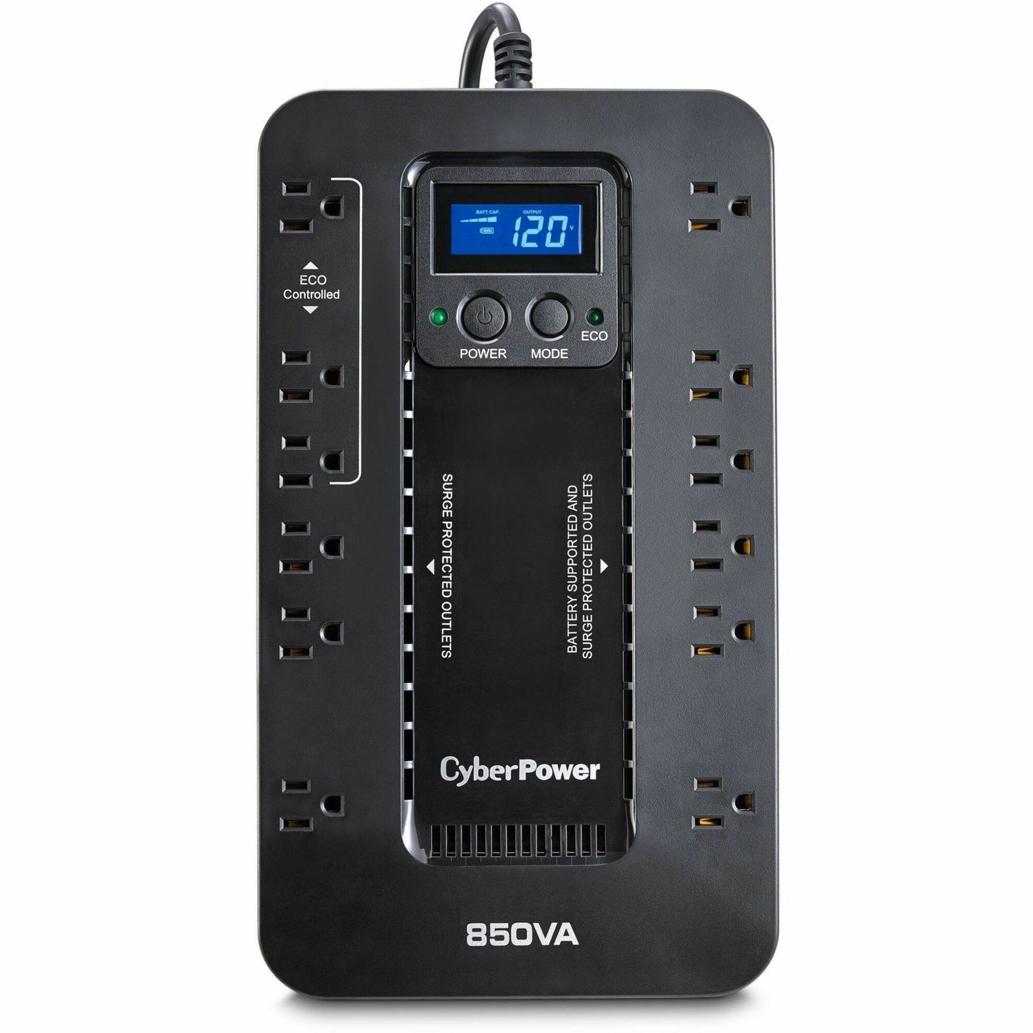 A compact UPS with standby topology, the CyberPower Ecologic EC850LCD provides battery backup (using simulated sine wave output) and surge protection for desktop computers, workstations, networking devices, and home entertainment systems. During power interruptions, the EC850LCD offers reliable power protection and battery backup. When the battery backup detects that the computer is off or in sleep mode, computer peripherals connected to the ECO Mode, surge protected outlets will be automatically turned off, reducing power usage and lowering energy costs (USB connection required). The multifunction LCD provides immediate, detailed information about the UPS battery and power conditions and generates alerts of potential problems before they can affect critical equipment and cause downtime. The EC850LCD comes with a three-year warranty (including coverage of batteries) and a ,100,000 Connected Equipment Guarantee.