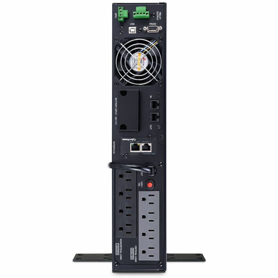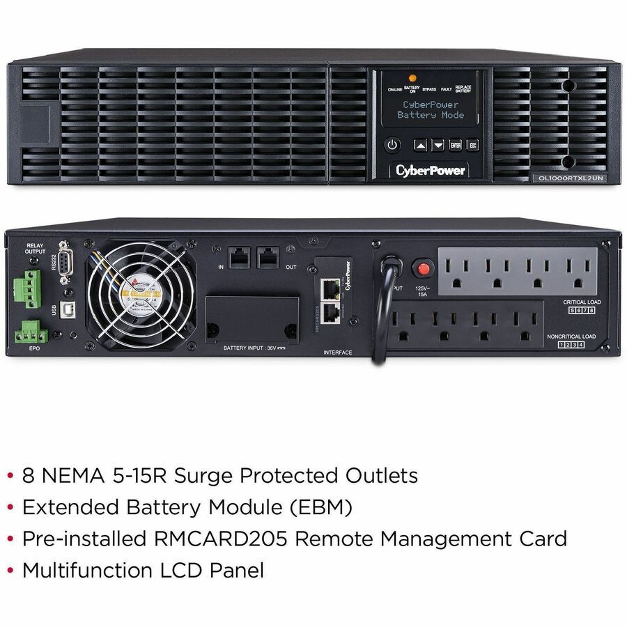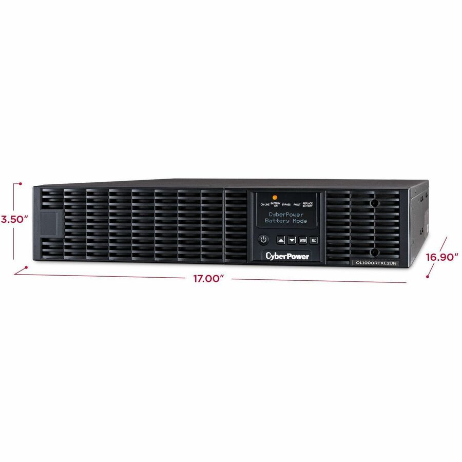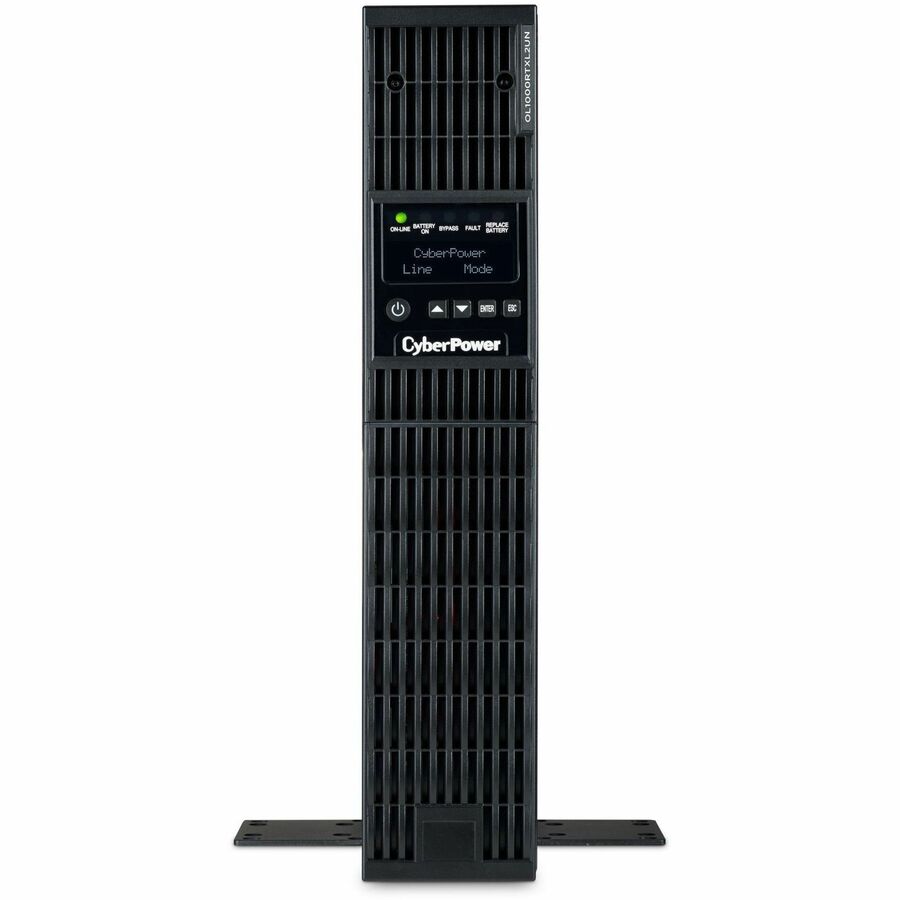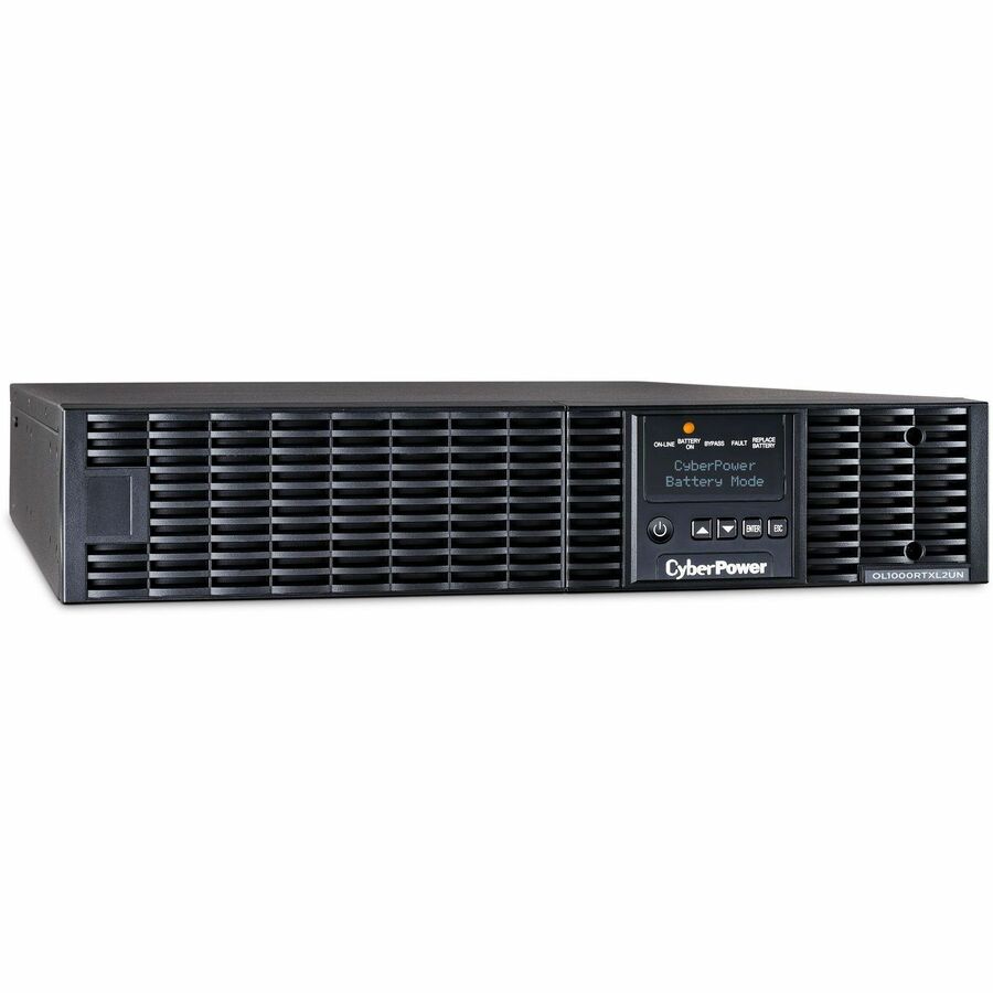 The CyberPower OL1000RTXL2UN is a rack/tower UPS with double conversion topology. It provides sine wave output to critical applications and equipment that require seamless power correction. The Extended Battery Module (EBM) expands runtime, and Fast Charge Technology restores full backup power faster. This model comes with an extendable LCD control panel, Smart Battery Management charging technology, and energy-saving GreenPower UPS™ ECO Mode.