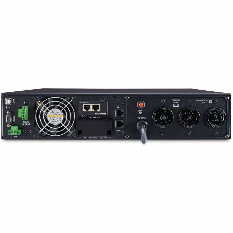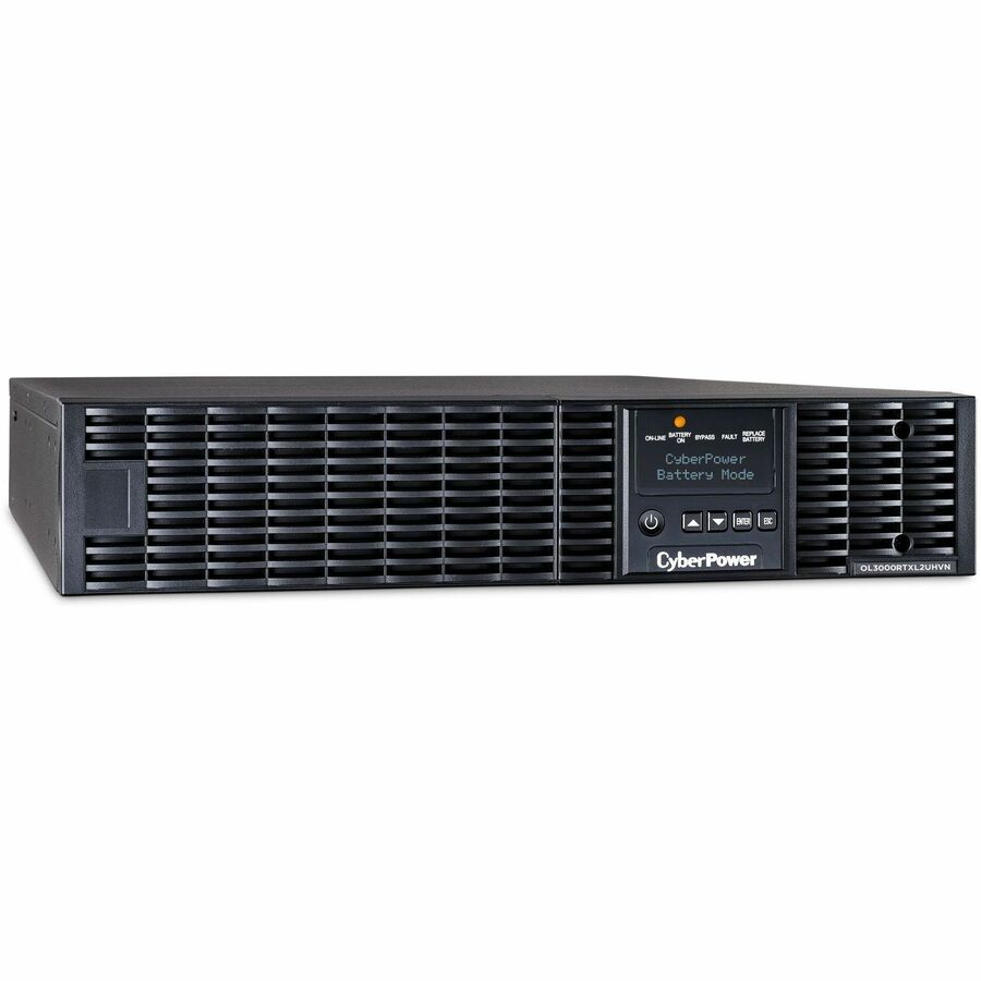 The CyberPower OL3000RTXL2UHVN is a rack/tower UPS with double conversion topology. It provides sine wave output to critical applications and equipment that require seamless power correction. The Extended Battery Module (EBM) expands runtime, and Fast Charge Technology restores full backup power faster. This model comes with an extendable LCD control panel, Smart Battery Management charging technology, and energy-saving GreenPower UPS™ ECO Mode.