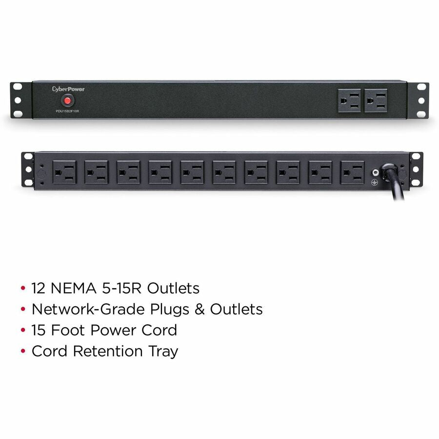 The CyberPower PDU15B2F10R, a 12-outlet (2 front, 10 rear) rackmount basic power distribution unit (PDU), provides 120V 15A output. It distributes power to 12 NEMA 5-15R receptacles from a single NEMA 5-15P input with unfiltered electrical pass-through. Designed for datacenters and other electrically demanding applications, the PDU15B2F10R has rugged, industrial-grade metal housing and a 15-foot AC power cord. It can be mounted either horizontally or vertically, includes a cord retention tray, and is ETL/RoHS certified. A limited lifetime warranty covers defects in materials and workmanship in the product under normal use and conditions.