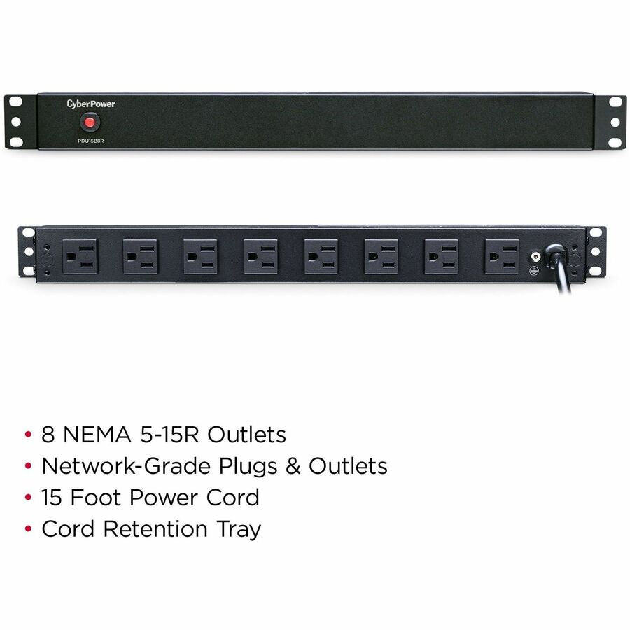 The CyberPower PDU15B8R, an 8-outlet (rear) rackmount basic power distribution unit (PDU), provides 100 - 125 V 15A output. It distributes power to 8 NEMA 5-15R receptacles from a single NEMA 5-15P input with unfiltered electrical pass-through. Designed for datacenters and other electrically demanding applications, the PDU15B8R has rugged, industrial-grade metal housing and a 15-foot AC power cord. It can be mounted either horizontally or vertically, includes a cord retention tray, and is ETL/RoHS certified. A limited lifetime warranty covers defects in materials and workmanship in the product under normal use and conditions.