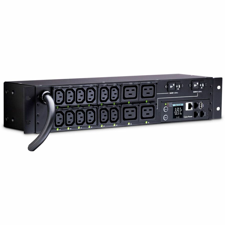 The CyberPower PDU41008, a 16-outlet (front), 2U rackmount switched power distribution unit (PDU), provides 200-240V 30A output. It distributes power to twelve (12) IEC C13 receptacles and four (4) IEC C19 receptacles from a single NEMA L6-30P plug with unfiltered electrical pass-through. The switched outlet receptacles can be managed individually or collectively over the network, using the CyberPower Management Console, a web browser and the RJ45 Ethernet port for network connection, or locally by using the LCD controls.