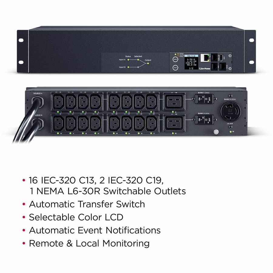 The PDU44007 supports inputs between 200-240V and includes (16) IEC C13, (2) IEC C19, and (1) NEMA L6-30R outlets. Dual NEMA L6-30P power cords are plugged into separate power sources (A and B), and information about each power source is clearly displayed on the front panel LED indicator lights. Other features include an LCD with selectable background color, built-in web interface, and power event notifications. The CyberPower PDU44007 is protected by a three-year limited warranty.