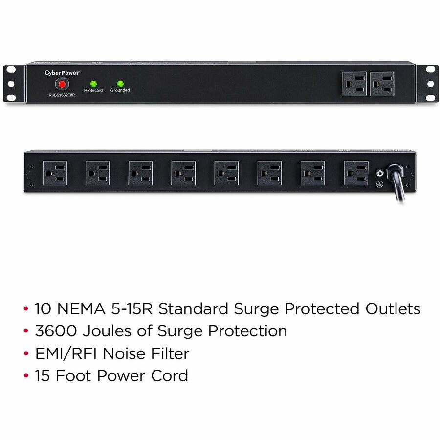 Engineered for the most demanding applications, the professional-grade Rackbar trade; Surge Protector RKBS15S2F8R from CyberPower safeguards systems and networking equipment by absorbing spikes in energy caused by storms and electrical power surges. Designed for network environments, the RKBS15S2F8R also performs superbly for home office use, providing 3600 joules of protection, 15-Amp electrical capacity with circuit breaker, and 10 surge-protected outlets (2 front, 8 rear). Industrial-grade metal housing keeps this Rackbar performing flawlessly. Two sets of mounting brackets provide flexible installation options: 1U rackmount (19 in.); 0U vertical rackmount and under-counter configurations.