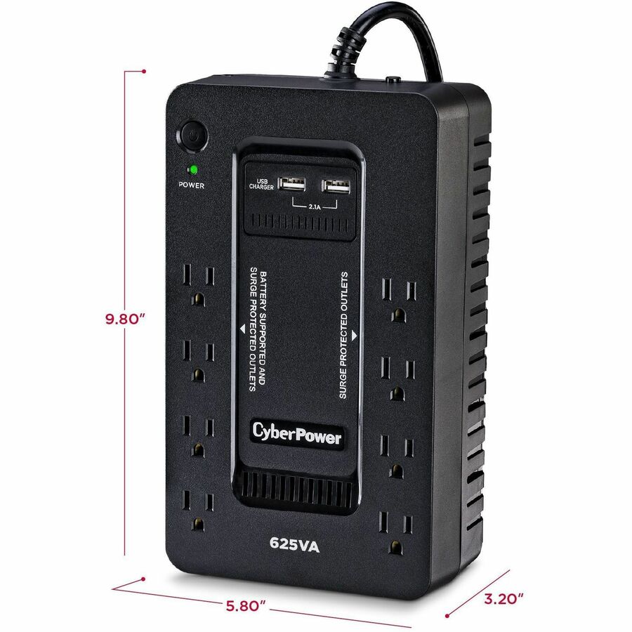 The CyberPower ST625U uninterruptible power supply (UPS) system provides battery backup and surge protection for lightning-induced surges and other power events that can damage electronic equipment. This unit delivers enough battery backup to power connected electronics through utility power failure and enough runtime to perform a graceful shutdown to protect against the loss of data and damage to valuable electronics during longer outages.