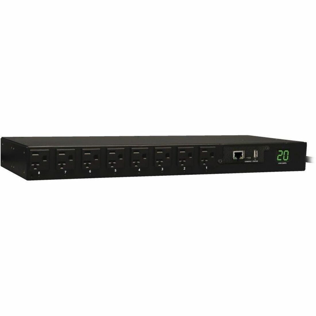 Tripp Lite single phase Switched PDU / Power Distribution Unit offers advanced network control and monitoring with the ability to turn on, turn off, recycle or lock-out power to each individual receptacle, monitor site electrical conditions and remotely monitor output power consumption. The built-in Java-free HTML5-based LX Platform network interface enables full remote access for PDU status monitoring and email notifications via secure web browser, SNMP, telnet or SSH. It supports 10/100 Mbps auto-sensing for optimum communication with an Ethernet network. Optional EnviroSense2 modules (sold separately) provide a variety of environmental monitoring capabilities. Protocols supported include IPv4, IPv6, HTTP, HTTPS, SMTP, SNMPv1, SNMPv2, SNMPv3, telnet, SSH, FTP, DHCP, BOOTP and NTP. Individually switched outlets can be controlled in real-time to remotely reboot unresponsive network hardware, or be custom programmed for user-defined power-up and power-down sequences to ensure proper startup of interdependent IT systems and prevent inrush-related overloads as network equipment is first energized. Unused PDU outlets can be electronically locked off to prevent the connection of unauthorized hardware. PDU output current consumption in amps is continuously displayed locally via visual meter and remotely via web/network interface to warn of potential overloads before critical IT mains or branch breakers trip.