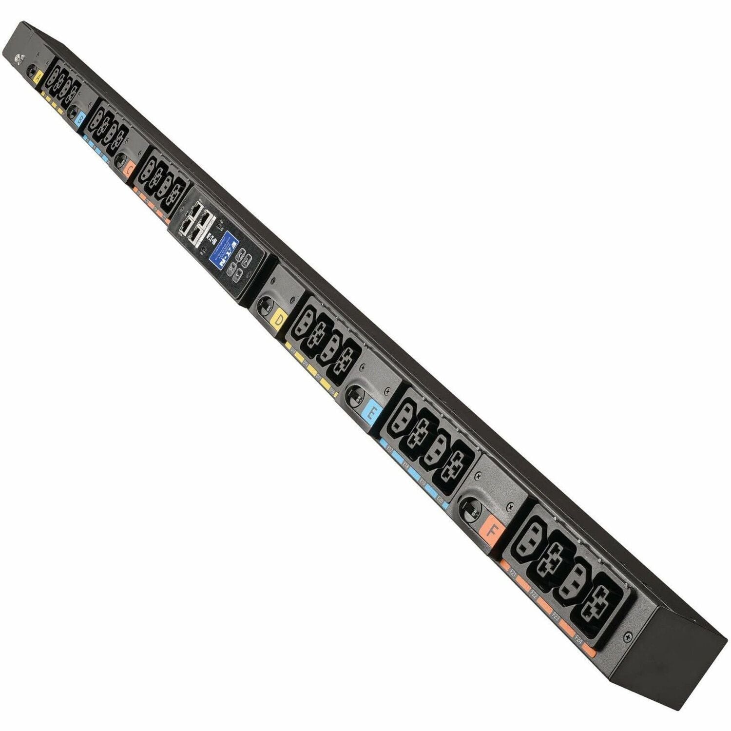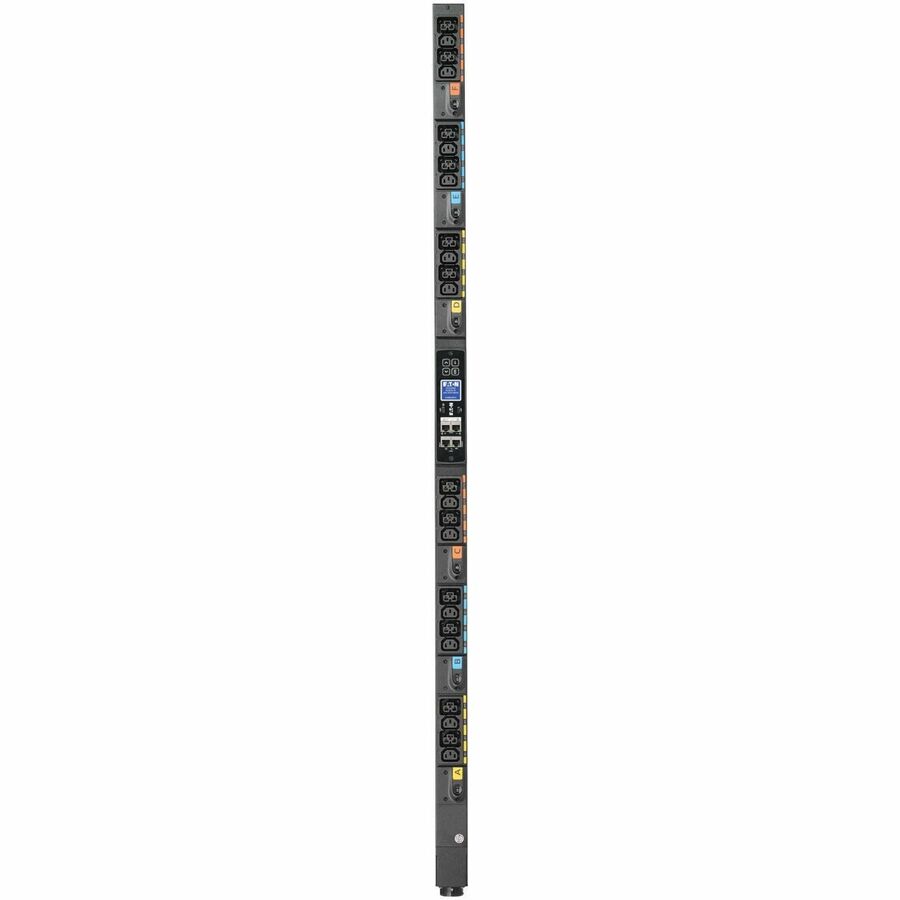 All outlets provide metering and monitoring for granular power data and precision control of power delivery. The outlets are evenly distributed into six color-coded load banks, each with its own circuit breaker, to improve load balancing and organize connections in a crowded rack.