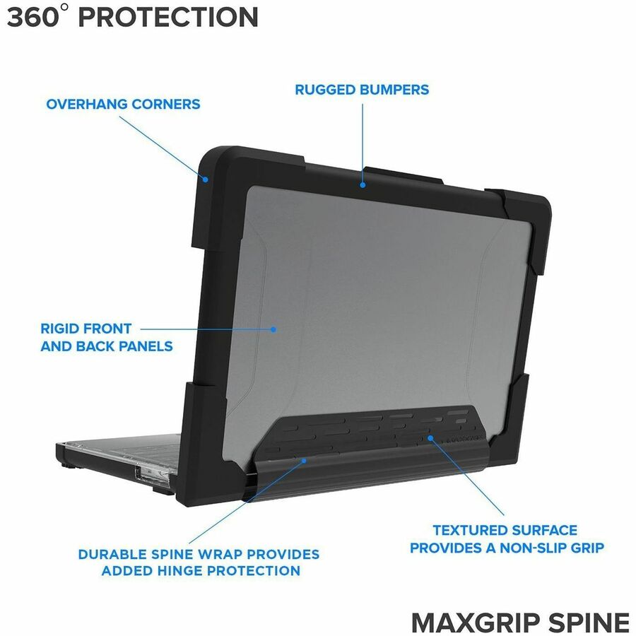 This tough, wrap-around case takes our popular Extreme Shell to new levels of protection and functionality with our new MAXGrip spine. Sporting rugged bumpers and overlap corners, the S model adds protection and functionality with an easy-grip, book-cover spine, designed to also protect the vulnerable hinge area. This wide, textured surface provides more secure carrying, delivering added insurance against drops. The rigid top and bottom panels made of compound polycarbonate, thermoplastic and polyurethane protect against scratches and impact damage. With a snug, perfect fit, the Extreme Shell-S supports all device functions and provides easy port access. Custom colors and MAXProtec antibacterial upgrade available with minimum quantity of 500 (additional fees apply).