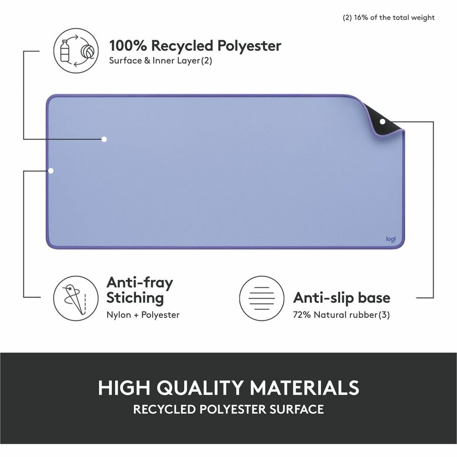 Logitech Desk Mat lets you find your glide and define your style, all while keeping your desk protected. Click some color into your workspace with your choice of aesthetics. The smooth, comfy, fine-weave surface delivers an effortless, silent glide for your mouse. Pair it with Logitech POP Icon Keys, POP Mouse, and more. Carefully chosen materials include recycled polyester for the surface and inner layer(2), giving a second life to PET bottles. Plus, an anti-slip rubber(3) base keeps it steady.