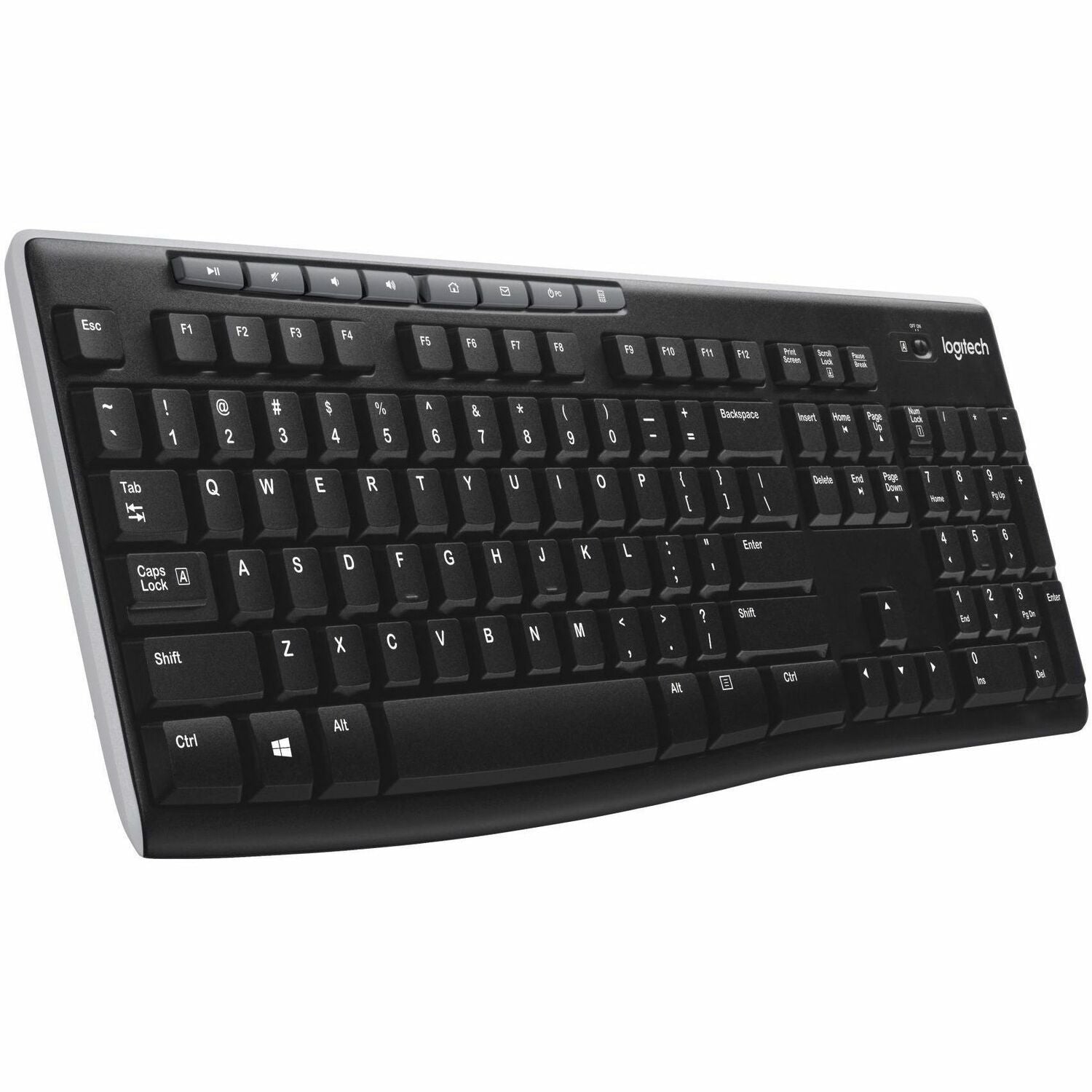 Logitech Wireless Keyboard K270. Reliable wireless-wherever you use your keyboard. The tiny Logitech Unifying receiver is small enough to stay in your laptop. Plus, you can easily add another compatible mouse or keyboard-without the hassle of multiple USB receivers. With Logitech Advanced 2.4 GHz wireless connectivity, you'll enjoy virtually no signal loss from up to 10 meters away.* You can go for two years without battery hassles.** Eight hot keys and plug-and-play setup that takes just seconds add to the simplicity. The familiar, full-size layout-including number pad-gives you all the right keys right where you'd expect them. And it's built to last with the high quality and reliability Logitech is known for-with a spill-resistant design*** and UV-coated keys for durability.