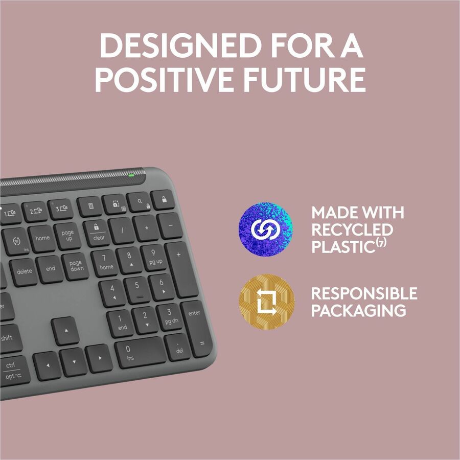 Switch typing between your computer, tablet and phone effortlessly with the Signature Slim keyboard K950, made with recycled plastic. Make work life magic with customization and shortcuts that keep you in control. Enjoy a familiar laptop-style keyboard feel that allows you to work even smarter with Logi Options+ App's custom shortcuts. Quiet typing gives you more focus, and less disturbance to others. Connect wirelessly with Bluetooth® or the included Logi Bolt USB receiver, and stay concentrated for longer with up to 36 months battery life .