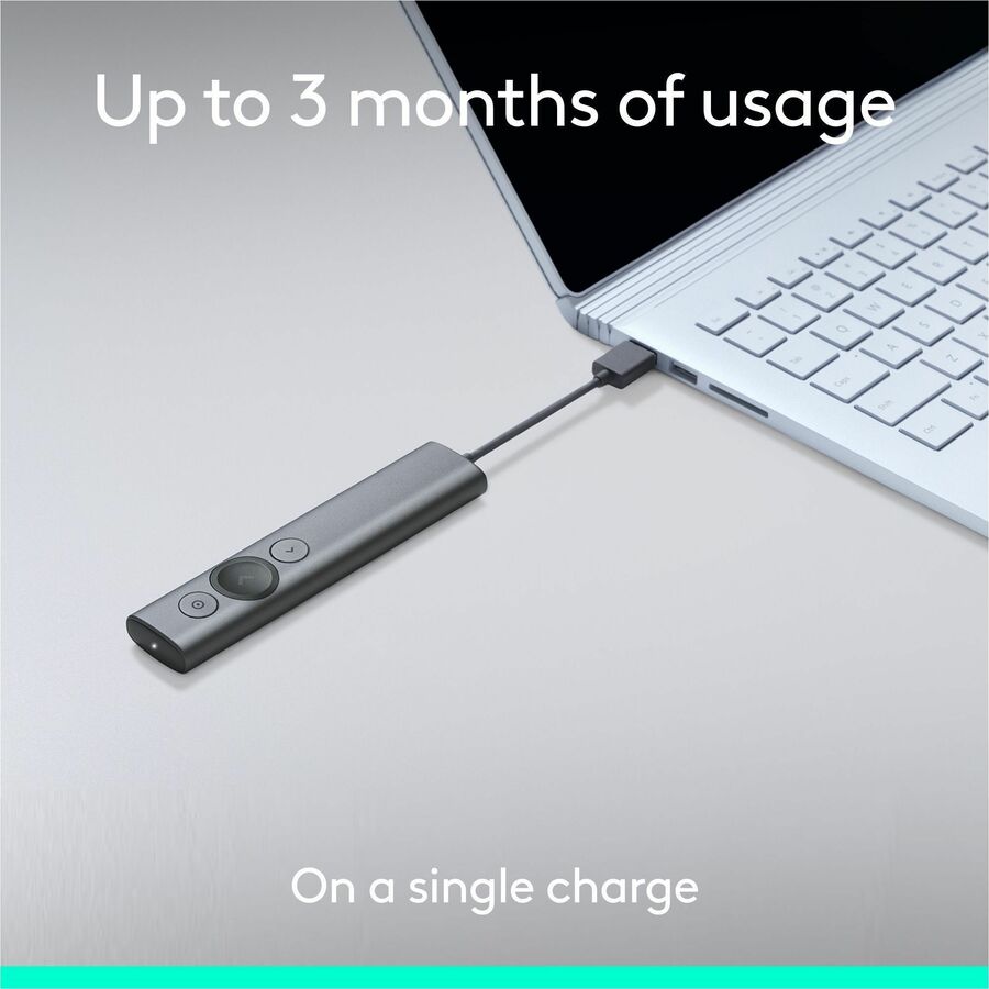 Spotlight allows you to simply navigate slides and interact with on-screen content from up to 100 feet away (2). The customizable timer sends haptic notifications directly to hand - and the advanced pointer system allows you to highlight and magnify areas of focus in pixel-perfect detail (1). Add to that gesture-commanded scrolling, panning, and volume control and you can be sure to crush every presentation. A full charge lasts up to three months (2), and Spotlight is plug-and-play on most devices and platforms running popular presentation software.