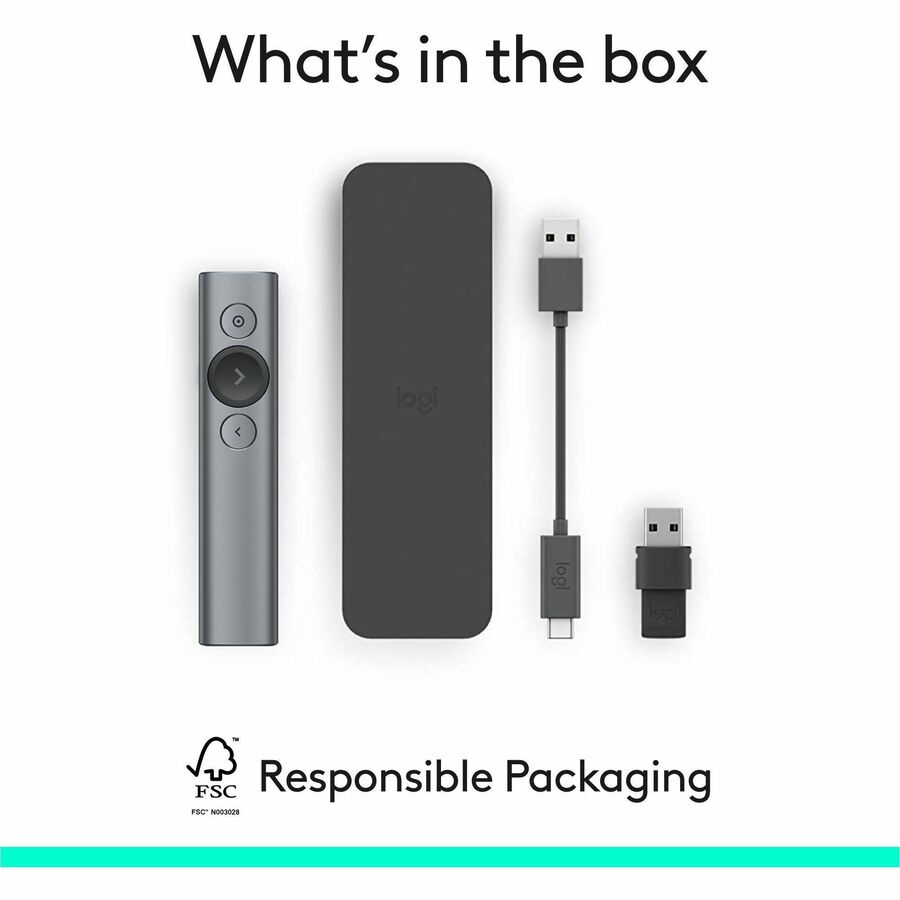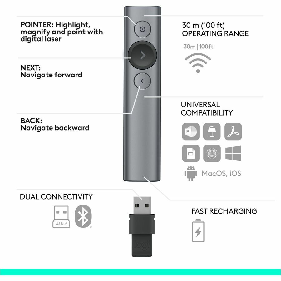 Logitech Spotlight Presentation Remote - Universal Wireless Presentation Clicker with Laser Pointer, Advanced Digital Highlighting, Bluetooth, 30 m Range and Quick Charging, Slate