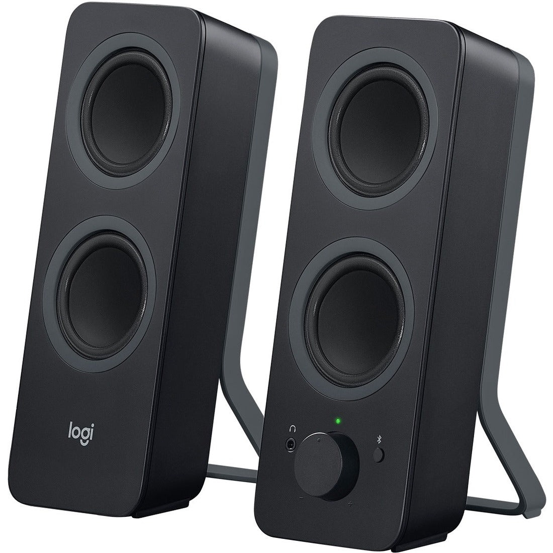 Bluetooth computer speakers deliver rich stereo sound at your desk. Stream audio wirelessly from up to two Bluetooth devices or connect one device via the 3.5mm input. Easy-Switch technology lets you seamlessly switch between audio sources by simply pausing the audio on one and pressing play on the other. 10 watts of peak power delivers room-filling sound from the four-driver design. Plus, two drivers create the perfect balance between the mid and high tones while two passive radiators deliver sharp bass. Easy-to-use controls are conveniently located on the right speaker for quick access to the Bluetooth pairing button, power, volume and headphone jack.