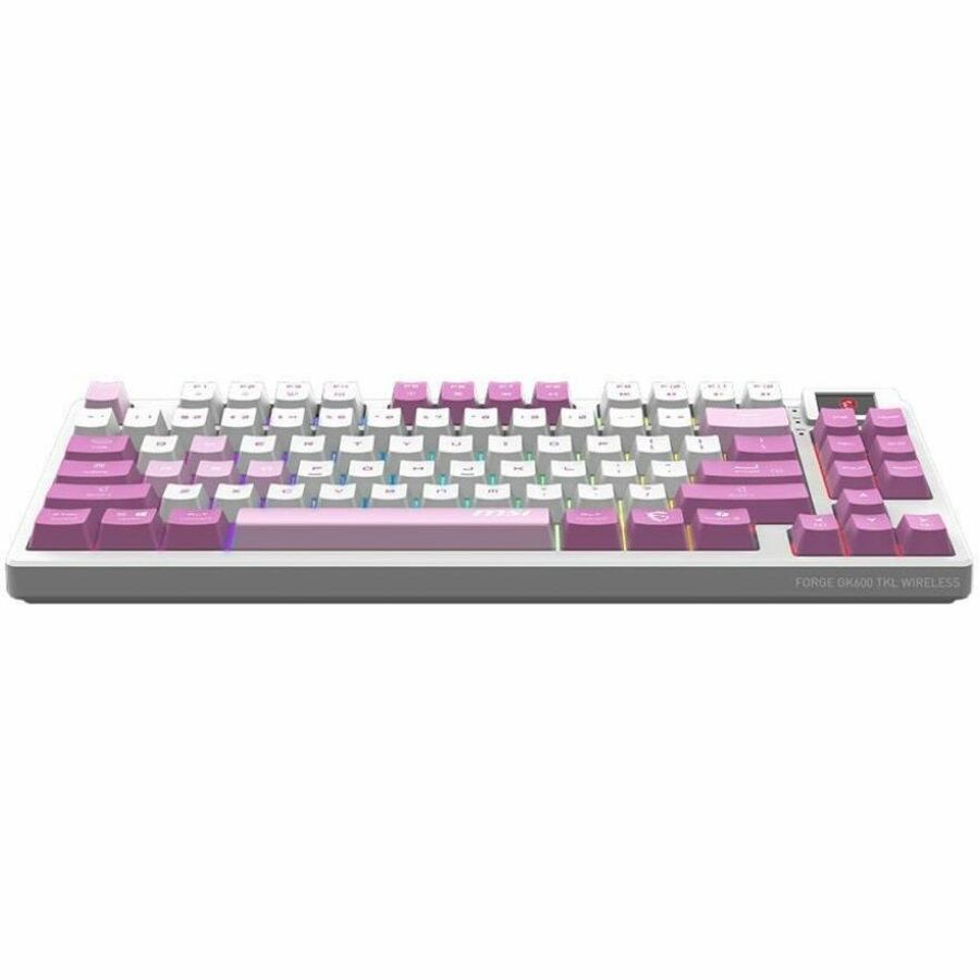The MSI FORGE GK600 TKL WIRELESS VIOLET is a versatile tenkeyless keyboard with 2.4GHz wireless, Bluetooth, and wired modes. It features hot-swappable linear mechanical switches, durable PBT keycaps, sound-dampening gaskets, and a 1.06-inch display. With RGB lighting and a 4000mAh battery, it's ideal for gamers and creators.