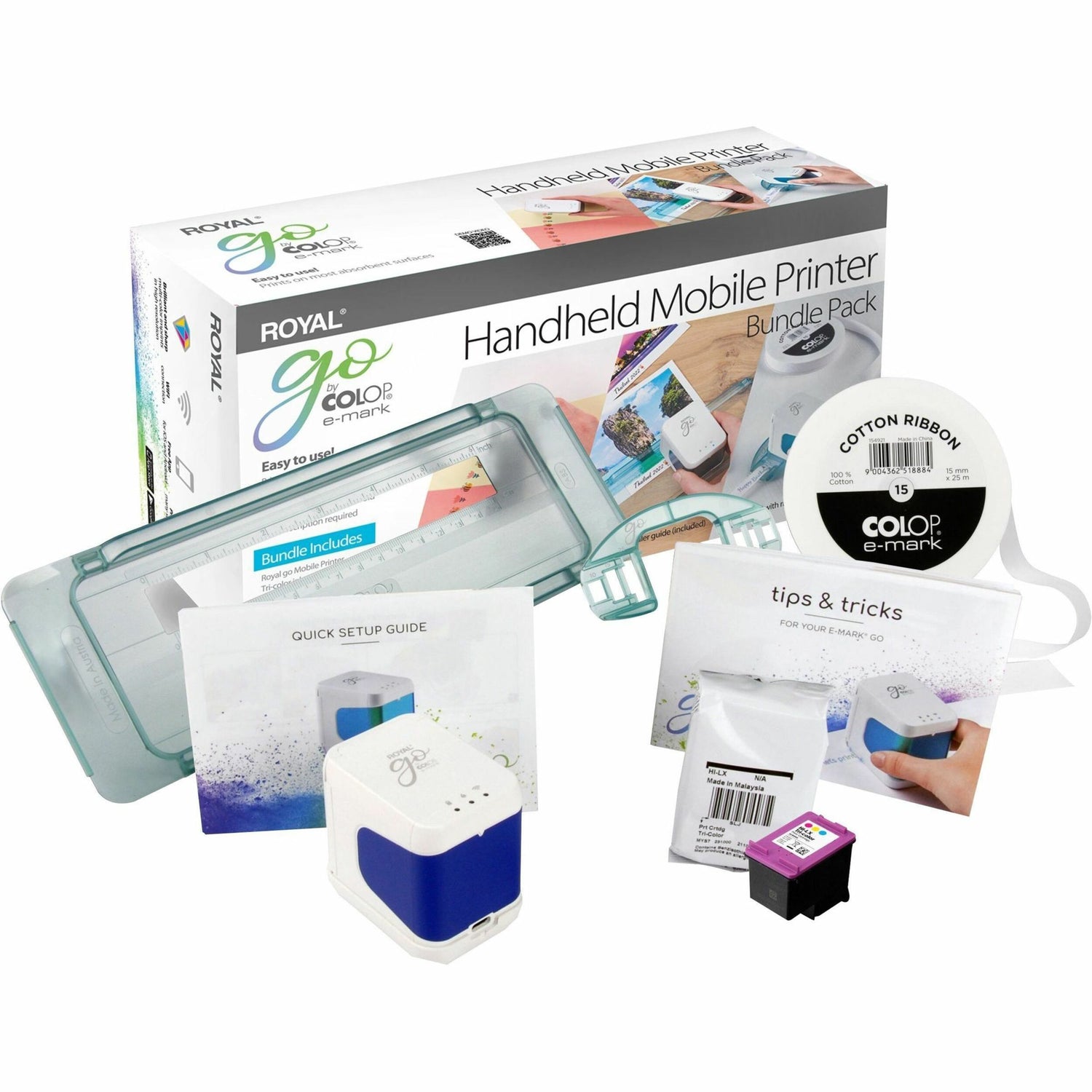 The Royal® e-mark® go, developed and produced in Austria, is one of the most compact and easy-to-use mobile printers on the market. With the intuitive app you create your individual imprint, send it and print it in full color on almost every absorbing surface. So just let�s print.It is equipped with the C2 ink cartridge for up to 1,500 multi-color imprints. This makes every print an eye-catcher, from the first to the last print: high-resolution, brilliant, clean. The Ruler helps you to print on edges, small objects and uneven surfaces. The Ribbon Guide facilitates printing onto ribbons (10, 15 and 25 mm) as well the e-mark endless label range. The useful tips and tricks brochure offers information on how to use the printer and many inspirations. Integrated QR codes lead to various videos.