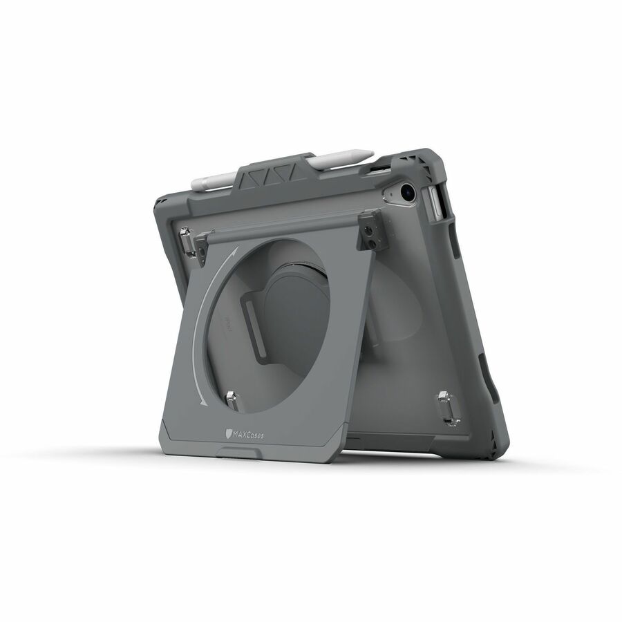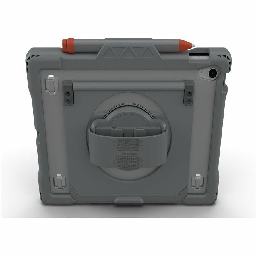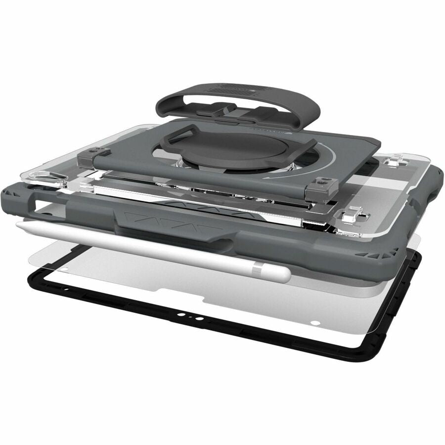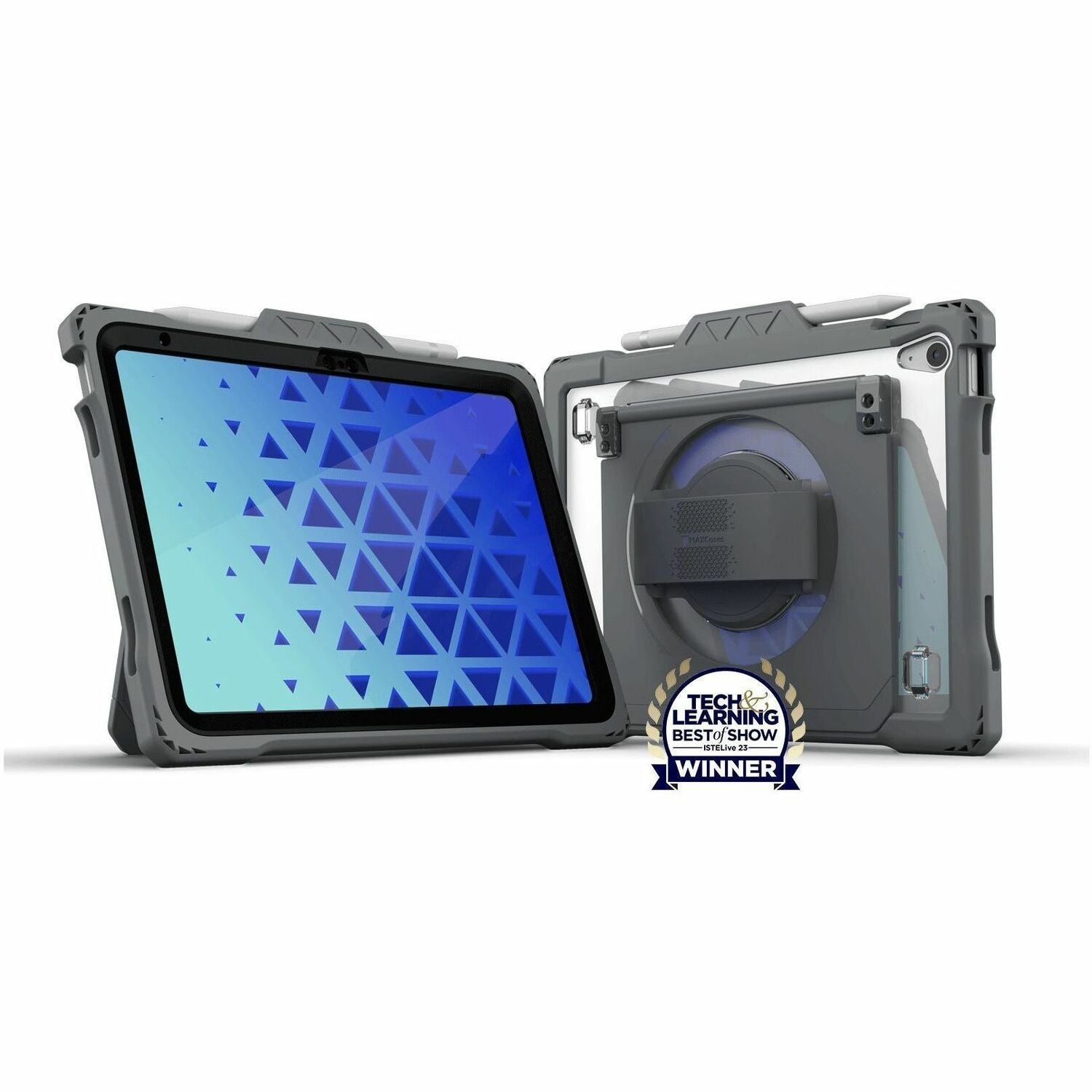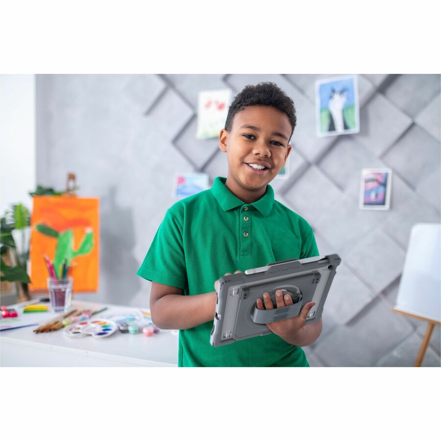 Featuring a rotating hand strap and the virtually-unbreakable FlexStand, the Shield Extreme-X2-H provides a perfect fit, handy features, and outstanding protection for the 10.9" iPad 10. Dual-layer bumpers deliver enhanced durability and shock dissipation, while the screen is safeguarded by a commercial-grade screen protector, for protection that meets MIL-STD 810G-516.6 standards for drop protection up to 6 feet. Users enjoy comfort and convenience with unlimited FlexStand positioning options, full 360-degree rotating silicone hand strap, and molded stylus holder that securely accommodates the Apple Pencil and Logitech Crayon. Allowing for easy cleaning, the hand strap is removable and replaceable. The custom design ensures easy access to all ports, openings, and buttons. Durable corner anchors make it easy to add an (optional) hand strap, shoulder strap or any clip-on accessory.