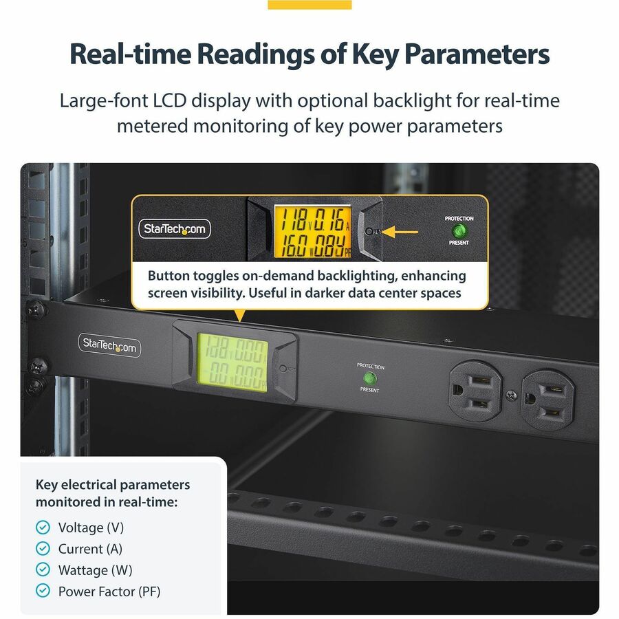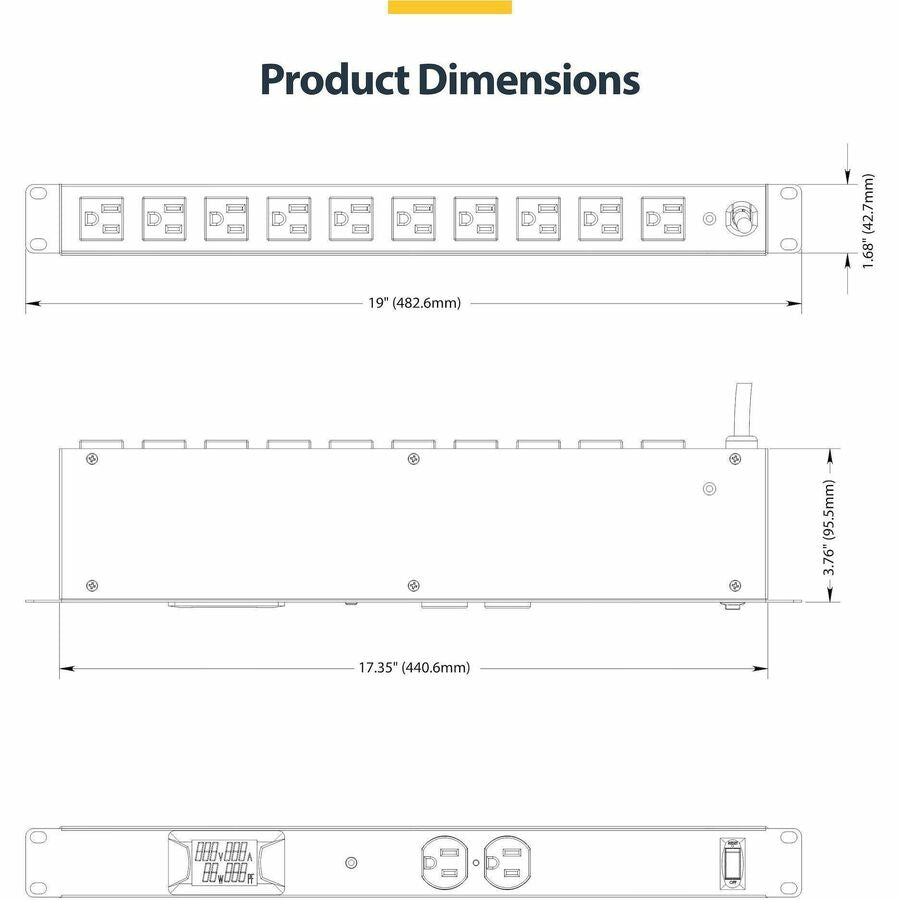 - 12-OUTLET 1U RACK MOUNTED METERED PDU: 12x NEMA 5-15R power outlets; 125V max and 15A circuit breaker; Built-in 8ft (2.4m) NEMA 5-15P power cord; Ideal power supply strip for 19"" racks in server rooms/closets, data center, and testing labs