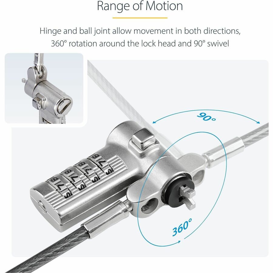 - CLEVER DESIGN: Ball joint enables 360° rotation, and the elbow joint's 90° pivot help reduce coiling and minimize strain on the slot; Protective spacers are included to prevent damage to the laptop and improve the fit; Carbon steel cut resistant cable