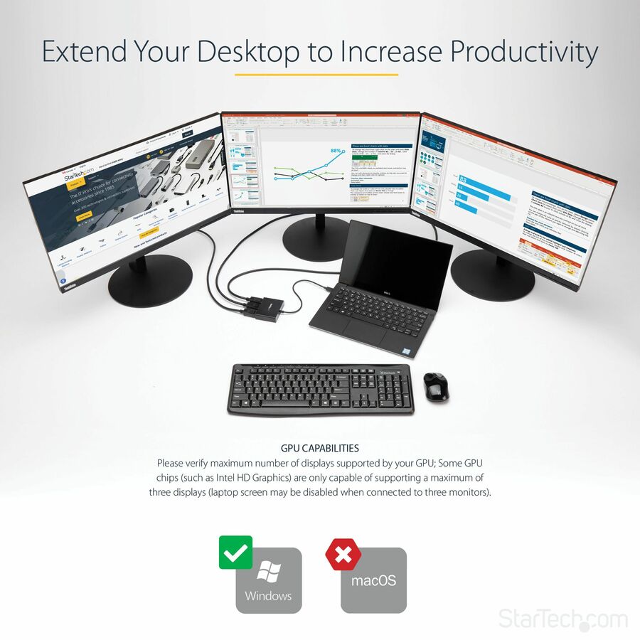 - GPU CAPABILITIES: Please verify maximum number of displays supported by your GPU; Some GPU chips (such as Intel HD Graphics) are only capable of supporting a maximum of three displays (laptop screen may be disabled when connected to three monitors)