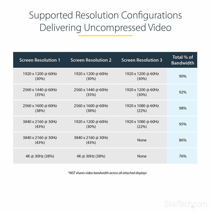 Note: MST shares 21.6Gbps across all attached displays. Higher resolutions can restrict the available bandwidth with the remaining ports, please see our guideline below for determining an ideal resolution for your setup.Certain graphics adapters have limited MST support and will only output to three displays in total. If more than three monitors are attached the fourth will be disabled. Some monitors limit available resolution