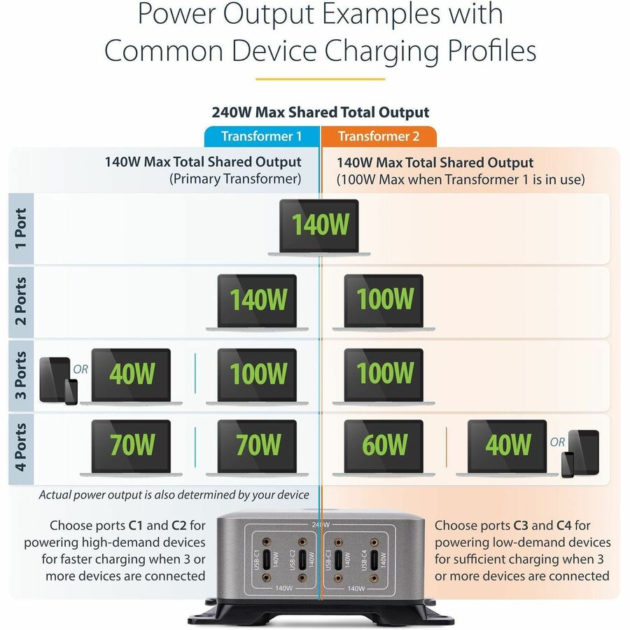 StarTech.com 4-Port Multi-Device USB-C Charger, 240W Total, Single Port 140W EPR, Screw Locking Ports, Ideal for Boardrooms
