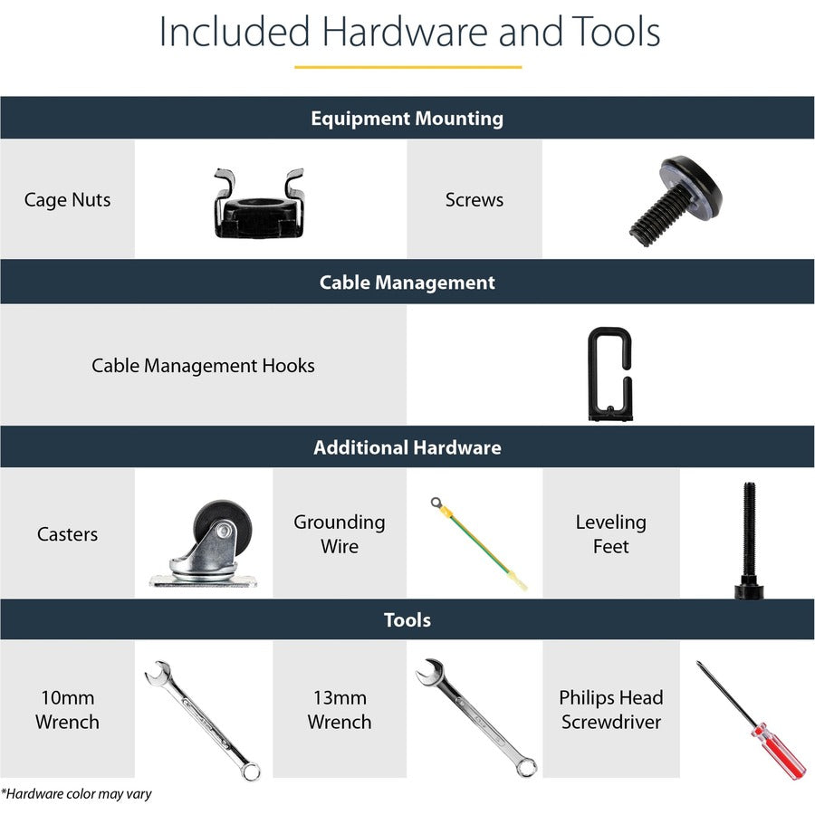 - HARDWARE INCLUDED: Rolling computer/data rack includes cage nuts and screws to mount equipment, easy to read Units (U) and depth adjustment markings, cable management hooks for organization, and required assembly tools