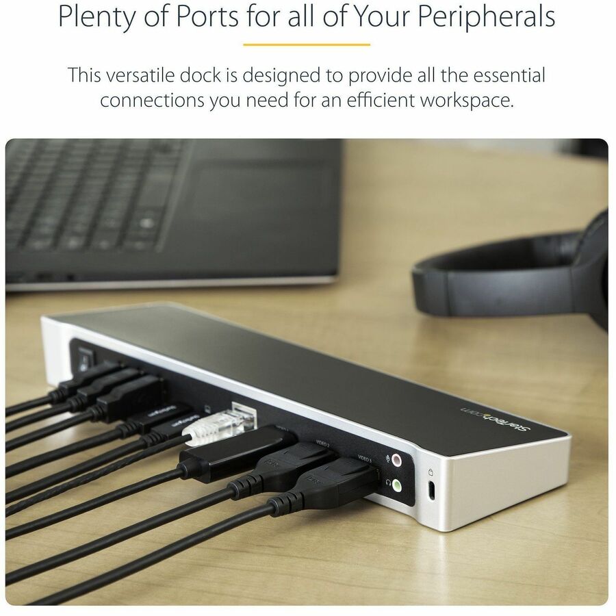 This triple-monitor docking station lets you transform your laptop into a full-sized workstation. It gives you five USB 3.0 ports (1x USB Type-C and 4x USB Type-A incl. 1x Fast-Charge port), a Gigabit Ethernet port, headset jack, and separate 3.5 mm audio and microphone ports.