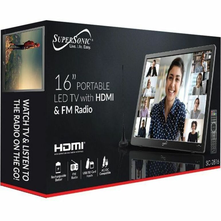 The Supersonic SC-2816 Portable 16 In. Widescreen LED TV omes with HDMI, allowing for single-cable convenience and incredible audio/video quality. The slim design keeps you focused on what's important-the picture. Discover how great that picture can be when you pay attention to the fine details. LEDs make more realistic light areas and dark areas. The TV has a built-in digital TV tuner. The HDMI input allows you to enjoy high definition video and audio so you can connect a true high-definition source, such as a computer, Blu-ray player, or video game console. The built-in lithium rechargeable battery and AC/DC operation allow you to watch your favorite shows at home or on the go. When the show ends, you can use it to listen to the built in FM radio. Multiple inputs allow you to play video and audio files from an external device.